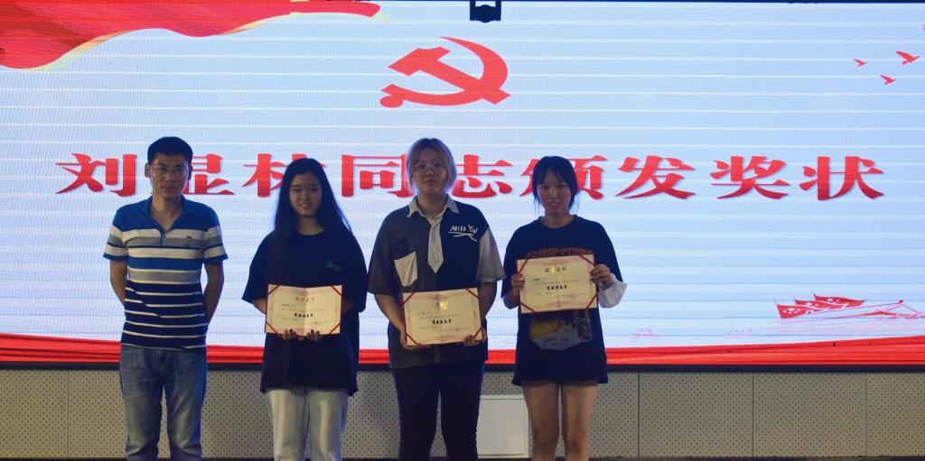 图:刘显林同志为吕瑜瑜、赵冰冰、王榕等3人颁发优秀党建信息员荣誉证书