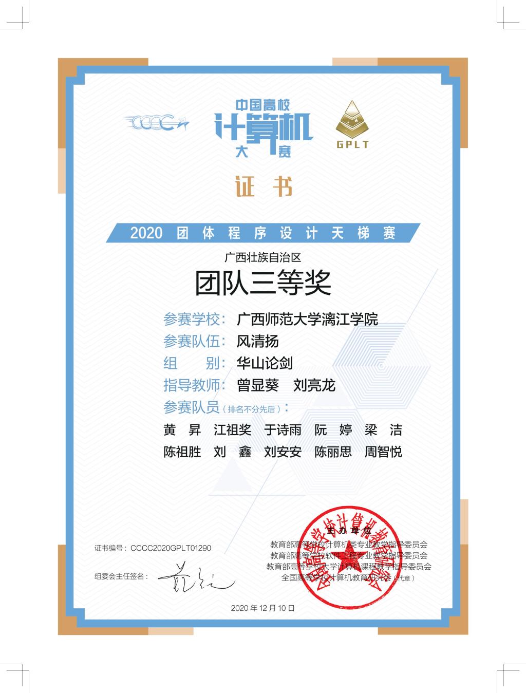 近日,从组委会传来喜讯,我院学子在2020年11月28日举行的第五届“中国高校计算机大赛-团体程序设计天梯赛”全国总决赛中获广西高校二等奖1项,团队二等奖2项、三等奖1项。