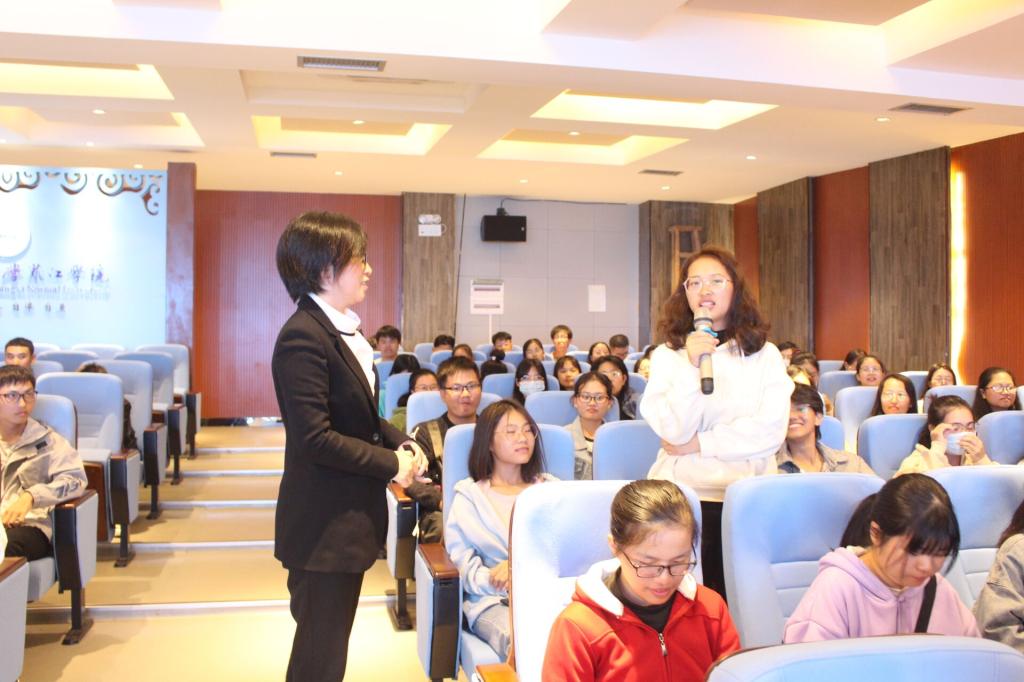 讲座伊始,邓慧玲老师询问新生是否了解国际教育,接着她提出如何进行大学职业生涯规划,以及如何储备专业知识为四年后打好基础,引导新生做与众不同的自己。