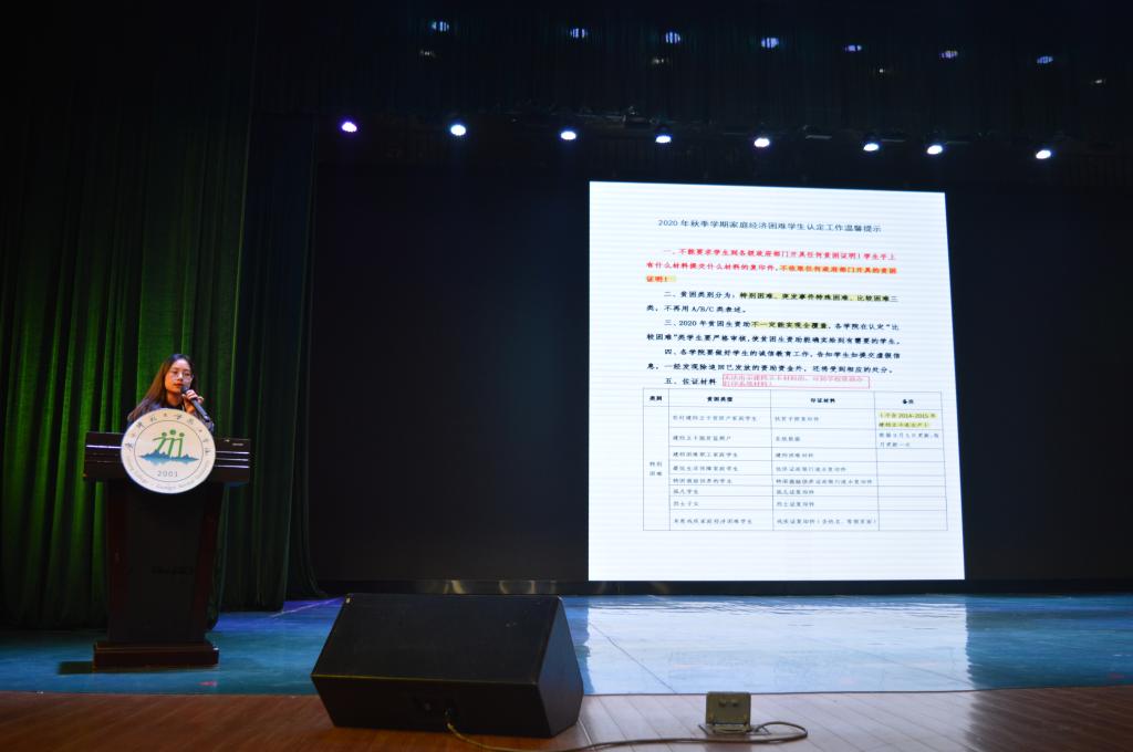 蓝贤斯介绍了高等学校贫困生认定政策,她从认定范围、认定标准、申请条件、佐证材料、贫困类型等五个方面依次进行了详细讲解。随后她还解读了学校的各类奖助学金、勤工助学、临时困难补贴等文件。在国家助学贷款部分,告诉学生知晓贷款利息、还贷期限、违约后果、生源地贷款等事项,告诫大家不要参与高利贷、校园贷等不良行为。确保新生入学后不必因为家庭经济原因而担心,保证家庭经济困难学生能够没有后顾之忧地在校安心学习、生活、成长、成才。