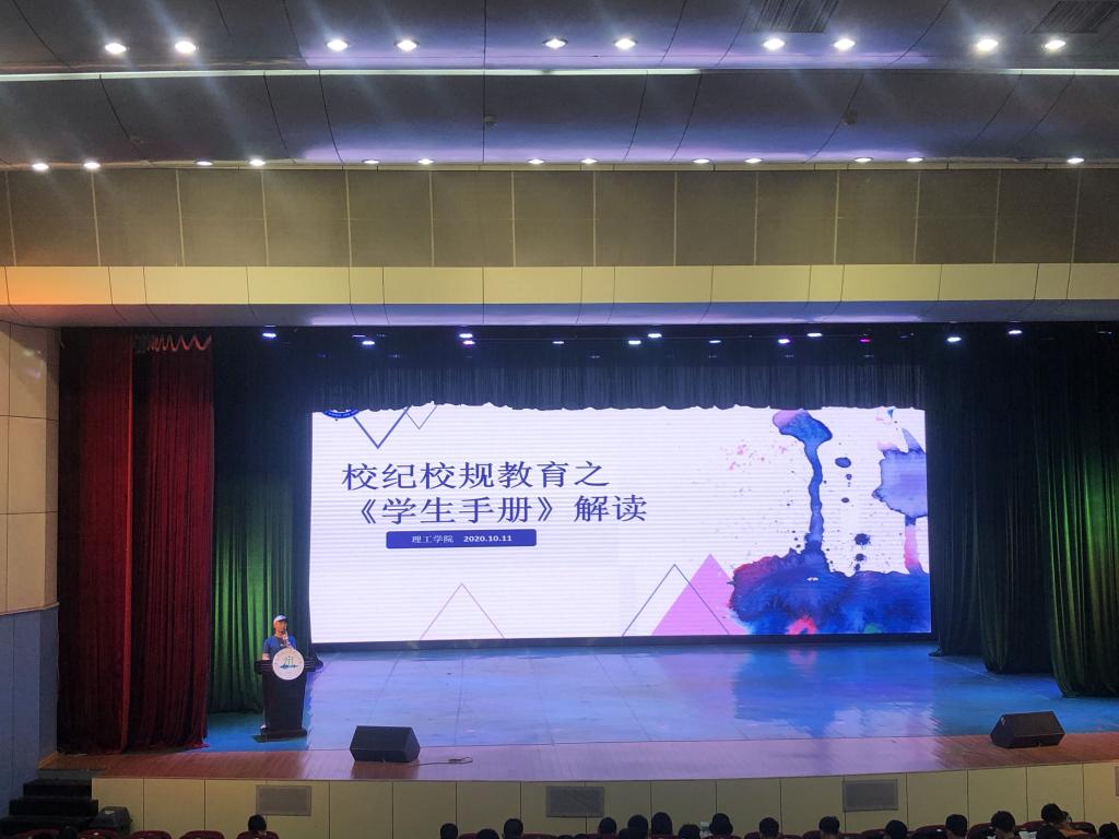 10月11日下午,理工学院2020级新生校纪校规教育之《学生手册》解读讲座在弘善讲堂举行,讲座由党总支副书记金云亮主讲,数学与应用数学、软件工程、数据科学与大数据技术、电子信息工程专业新生共341人到场聆听。此次讲座是为了让学生更早适应大学生活,了解校纪校规,平稳的度过大学四年。