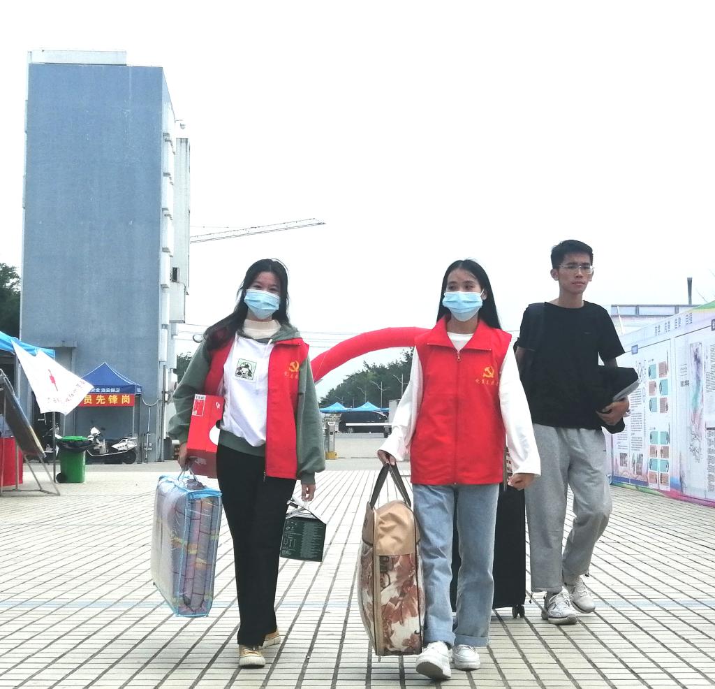 一大早,学生党员们就到达接待大本营,统一着装,亮出党员身份,为迎接新成员到来做好了充足的准备。他们积极帮助搬运行李,服务报到注册,耐心答疑解惑。学生党员代表邓月梦说:“大一入学报到时,犹记得是一名学生党员的学姐带我完成当天的报到工作,内心非常感激。而如今自己也成为一名预备党员,有幸作为迎新志愿者,去传承这份爱与责任。能够尽自己的微博之力帮助学弟学妹,我很开心。我也相信他们会继续把这份爱传递下去。”