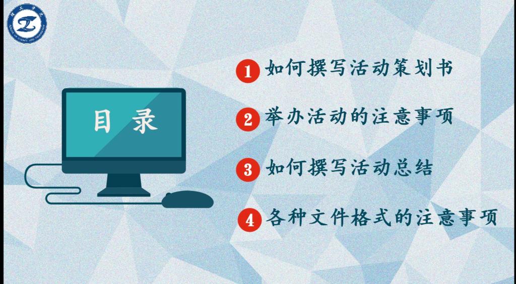 活动以线上形式开展,全体团总支学生会成员积极参加。吴锦敏从“如何撰写活动策划书、举办活动的注意事项、如何撰写活动总结、各种公文格式的注意事项”四个方面进行讲解。如何撰写活动策划书方面她讲述了策划标准格式,策划书字体要求,对“外”、对“内”活动策划的不同要求;在举办活动的注意事项方面她着重讲解了活动在前期、中期、后期需要注意的事项;在如何撰写活动总结的方面她具体讲述了活动总结五部曲的重要性,强调了在活动总结中标题和落款的格式要求;在各种文件格式的注意事项方面进一步明确指出将文件上交至不同组织时的文件格式、名称的变化等等。吴锦敏的细致讲解使成员更进一步了解与巩固相关的公文知识,提高了成员们的工作积极性。