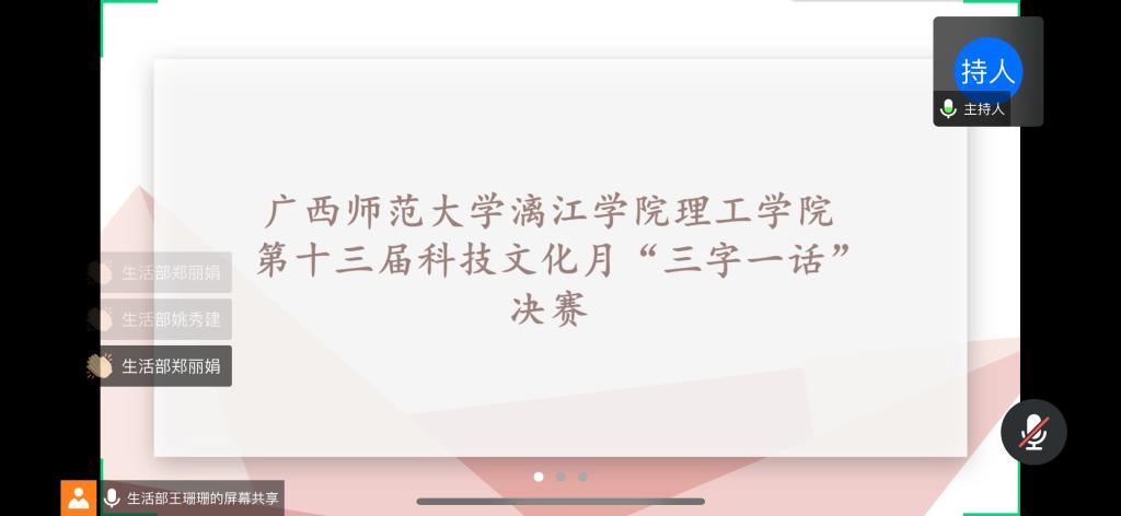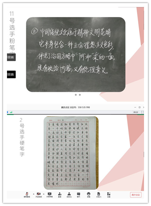 加强师范生教师技能的训练,使同学们在活动中相互学习、互相进步,为今后的职业生涯奠定基础。理工学院第十三届科技文化月子活动之“三字一话”师范生技能大赛决赛于6月3日晚利用腾讯会议举行。出席决赛的评委有院党总支副书记金云亮、第一学生党支部书记刘显林、团总支书记李莉、政治辅导员蒋倩。