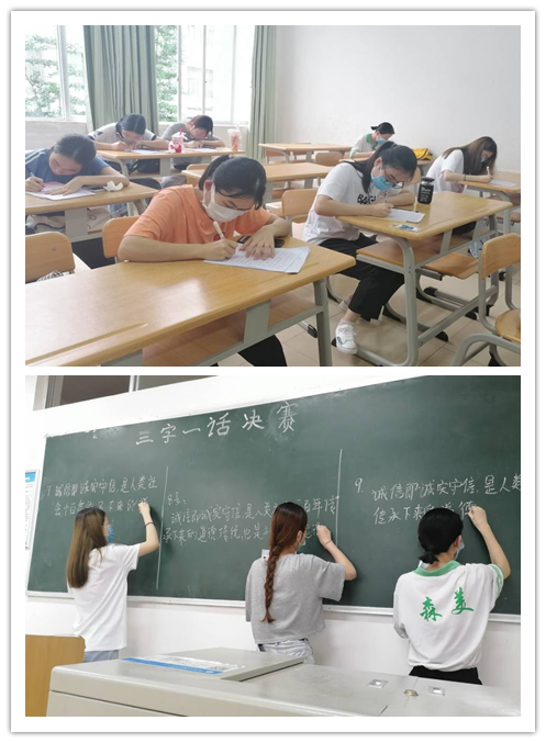 本次决赛分为三项内容,分别是硬笔字、粉笔字和普通话,硬笔字和粉笔字的书写在决赛前一天开展,工作人员收好选手硬笔字作品和粉笔字作品后拍照,并在决赛当天选手进行普通话比赛的同时展示给评委打分。比赛内容选用习近平用典、习近平在抗击疫情中的经典语录、中国传统文化诗词等。从初赛中脱颖而出的13位选手在决赛中各放光彩,力争前茅,最终评选出一等奖1个、二等奖3个、三等奖3个以及优秀奖6个。