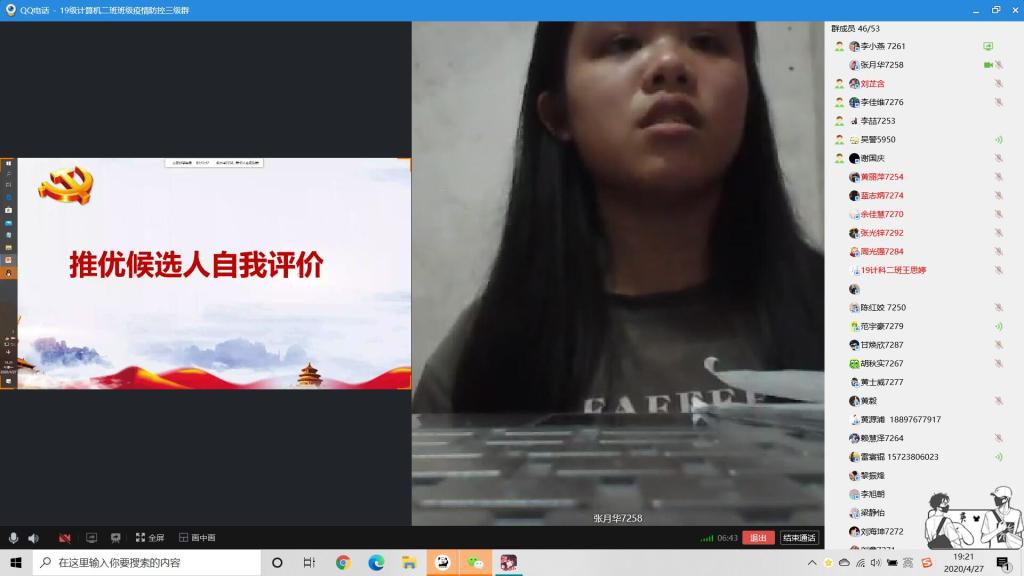 由于疫情原因,本次“入党推优”大会均以线上形式进行,各团支部使用腾讯会议或QQ群的方式开展“入党推优”大会。会上,推优候选人进行自我评价,随后回答嘉宾提问,各团支部成员积极参与,利用QQ群投票。10个团支部开展大会,共有40人成功推优为入党积极分子,推优成功率达100%。