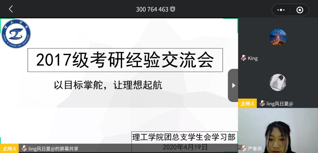 为切实加强学风建设,助力考研学子,4月19日晚,理工学院团总支学生会利用腾讯会议举办考研经验交流会。参加活动的有理工学院党总支副书记金云亮、柳州铁五中学教师吕延丽、玉林市师院教师吴荣火和2017级辅导员蒋倩。活动由2019级数学与应用数学专业严春燕主持。