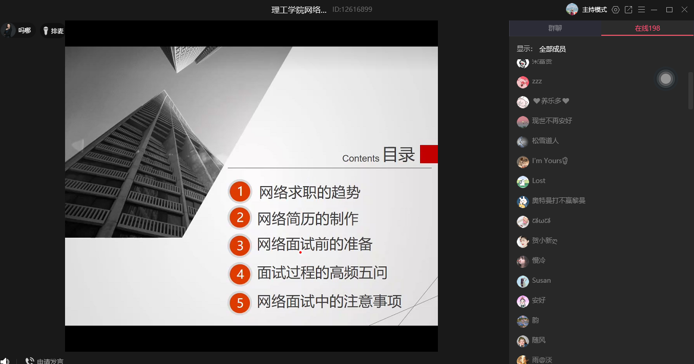为提高学生简历制作技能,增强学生网络求职技巧,林欣从“网络求职的趋势”、“网络简历的制作”、“网络面试前的准备”、“面试过程的高频五问”、“网络面试中的注意事项”五个方面给同学们进行了详细讲解。她呼吁大家先就业再择业,积极面对疫情下的求职困难,把握当前求职机会,多参加网上招聘会,学会利用广西人才网等招聘网站制作精美简历,有方向、有目的地选择就业岗位,尽快找到工作。