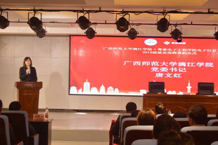 仪式在浓重的国歌中拉开序幕,唐文红书记代表学校领导对广州粤嵌公司与我校的合作表示热烈欢迎,她表示,这是我校与广州粤嵌通信科技股份有限公司合作进程中的重要一环,是具有里程碑意义的一件大事。这一份就业保障协议对广州粤嵌通信科技股份有限公司来说是一份责任,更是一份担当;它体现了广州粤嵌通信科技股份有限公司对高等教育尽责的一种情怀。唐书记也对我校首届粤嵌卓越班全体同学提出要求,她希望大家根据就业保障协议制定自己可行的学习计划及中长期目标,认真学习、不负韶华,一步一脚印地努力前行,用辛勤的付出来收获灿烂的明天。