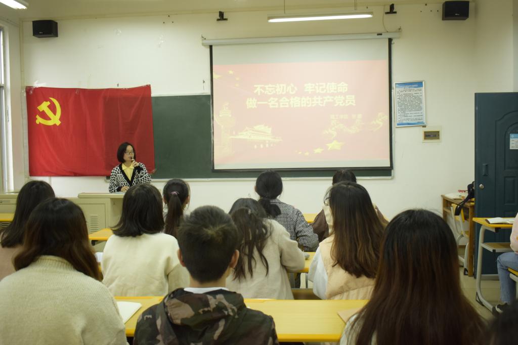 首先,由支部书记贺娜上党课。她围绕“不忘初心、牢记使命”提出的背景、“初心”和“使命”是什么、不忘初心,如何做“四讲四有”的合格党员三个方面进行讲解。通过本次党课学习,不仅重温了党的历史,也激励全体学生党员守初心、担使命,积极主动投身到学习工作中,把学和做结合起来,严格要求自己,争做党员先锋模范。