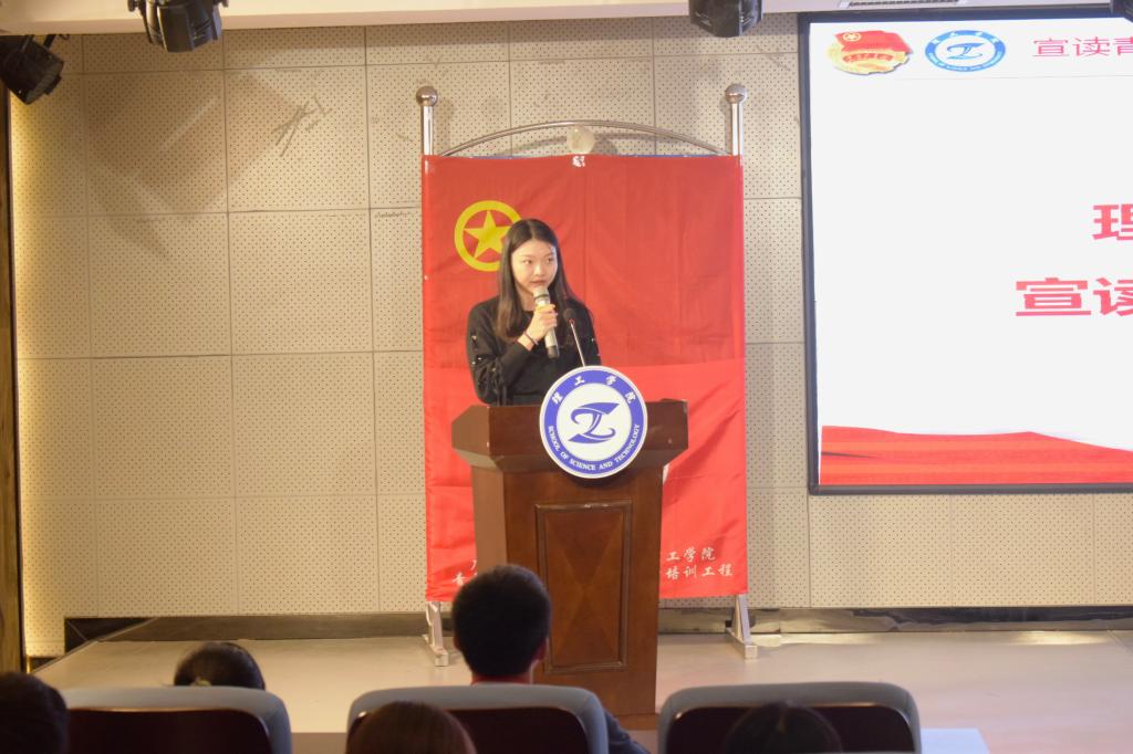 李莉老师宣读青马班学习流程和考核制度,她希望每一个青马班的成员都能遵守规章制度,严守纪律,坚定跟党走中国特色社会主义道路的信念,成长为中国特色社会主义事业的合格建设者和可靠接班人。青马班成员赵康悦同学发言,并带领全体成员重温入团誓词。
