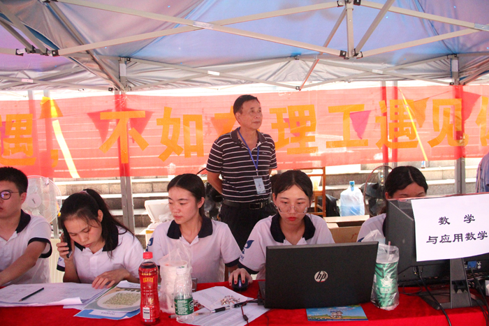 图3:党总支书记谢国榕(左三)到现场看望工作人员、新生及家长