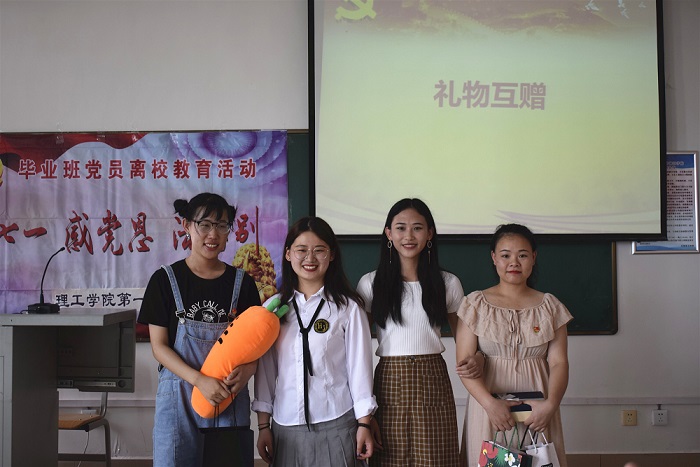 随后,毕业班党员与非毕业班党员互赠礼物,每一位党员都给自己想祝福的那个他(她)送出了精心挑选的礼物,“我想把这罐可乐送给蒋洁学姐,希望你在未来的日子里,每天都有‘可乐’的事……”,“我想把这本笔记本送给李小梅学妹,希望这本笔记本能陪你走过考研的历程,写下你想留住的美好时光……”,“我想把这两个风铃送给吴婷学姐和张钦学姐,这两个风铃是自己手工做的,希望你们未来前程似锦,生活幸福……”最好的祝福送给最亲的人。没有贵重的礼物,却有最真挚的祝福,愿毕业的你们前程似锦,扬帆远航。