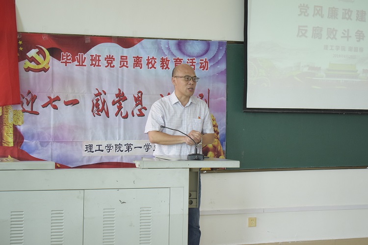 谢国榕同志为毕业生党员上题为《党风廉政建设和反腐败斗争》的党课。他为毕业生党员们深入解读反腐倡廉的必要性,同时围绕“不敢腐,不能腐,不想腐,不易腐”给党员们送出“廉风锦囊”。