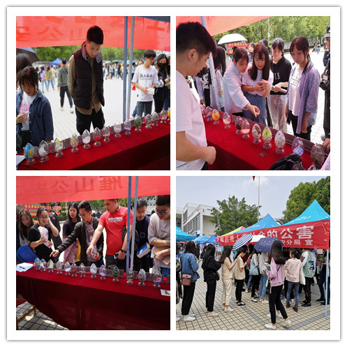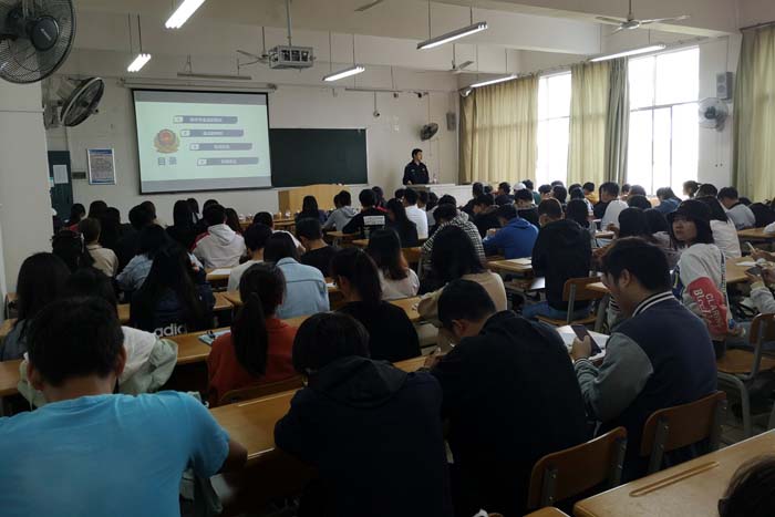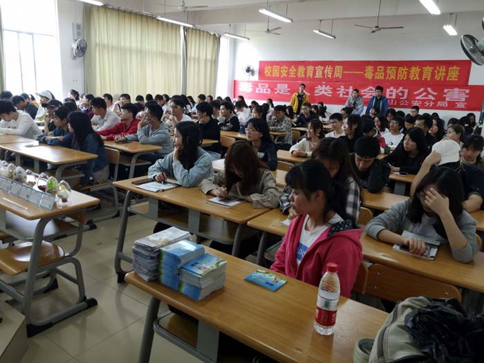 黄国兵副队长与同学们分享了亲身办案的经历。陆群凤民警从桂林市毒品的现状、毒品的种类以及危害、如何抵制毒品等方面进行了详细介绍,并对常见毒品进行了现场展示。为了让更多同学了解毒品知识和危害,讲座后,禁毒支队民警还在乐善广场进行毒品展示,工作人员向前来咨询的师生发放《抵制毒品宣传手册》并进行讲解。
