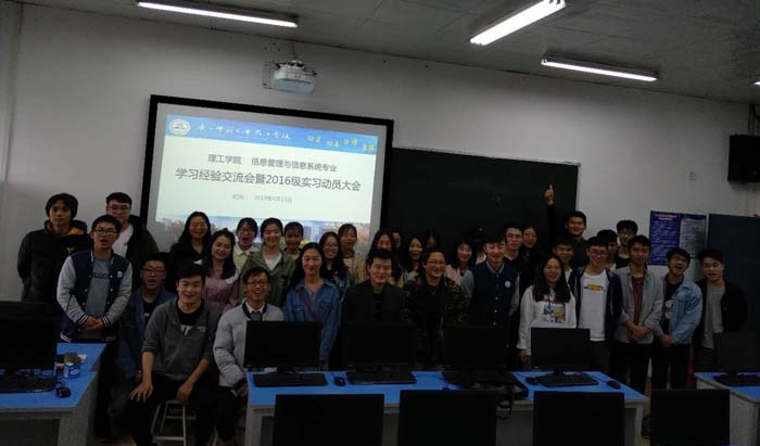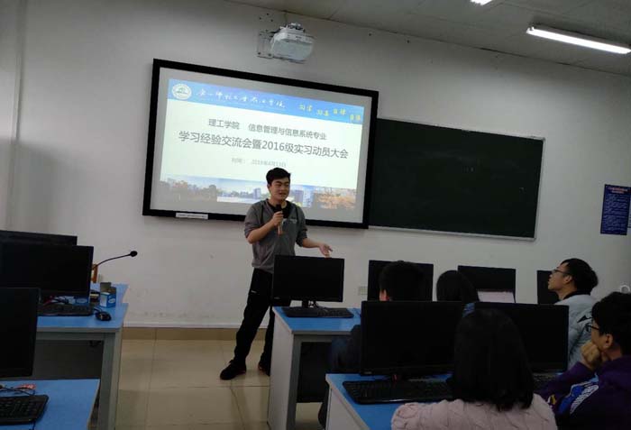 4月13日,我院信息管理与信息系统专业(以下简称,信管专业)召开了学习经验交流会。经验交流会由信管教研室组织召开,由2015级信管专业中实习表现优异的4位学生代表向2016级信管专业的全体同学传授了他们的学习经验及实习心得,并提出了良好建议。