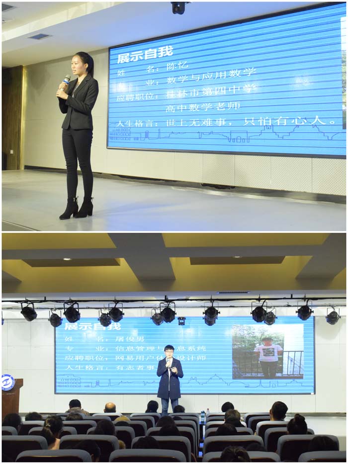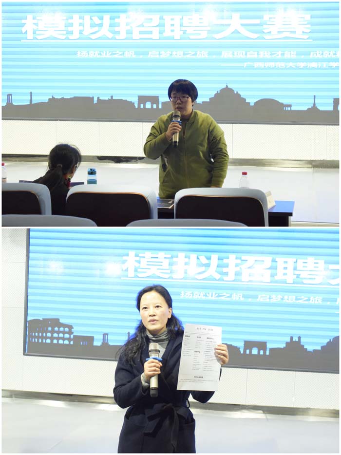 11月17日下午。理工系在至善讲堂举办了以“扬就业之帆,启梦想之旅,展示自我才能,成就精神人生”为主题的模拟招聘大赛。此次模拟招聘大赛,邀请了东方益学集团助理副总裁、桂林分校负责人梁燕和桂林分校人力资源部经理肖艳玲,理工系党总支书记谢国榕、专任教师沈阳、辅导员刘显林担任本次活动的评委。2015级数学与应用数学、计算机科学与技术、信息管理与信息系统专业的毕业生参加大赛。