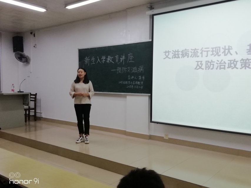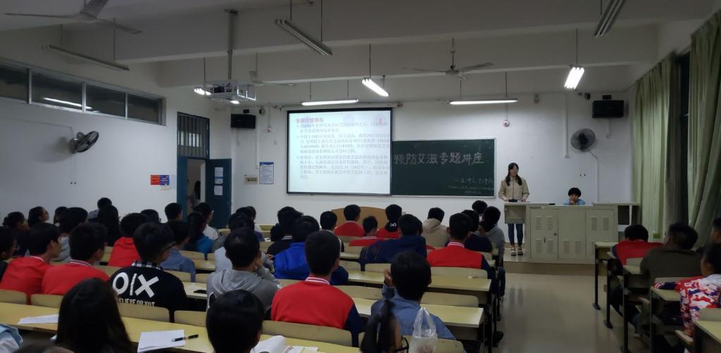 蒋倩、于诗雨两位同学分别为2018级数学与应用数学、计算机类的新生开展“艾滋病流行现状、基本知识及防治政策”主题讲座,她们向同学介绍了关于艾滋病的疫情情况、起源、发病症状、临床表现、传播途径、危害、预防措施等相关知识。在讲座过程中同学们不仅了解到有关预防艾滋病的相关知识,还成功地扫除了关于艾滋病的一些误区并学习到如何正确的对待艾滋病人的方法。在这次讲座中同学们受益匪浅,并坚定“远离艾滋,身心健康”。