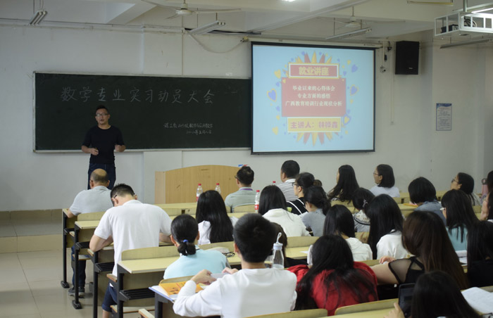 蒋琼女士介绍柳州博学教育集团历史和企业文化,并对博学教育提供给同学们实习岗位的工作内容、实习管理和福利待遇进行了详细说明。博学教育教学部主管、 2005级数学与应用数学专业校友林桦森分享他毕业十年来的工作经历和感受,勉励学弟学妹们要增强自信,锲而不舍,提升自身的综合素质能力,终究会打拼出属于自己的事业和爱情。提问环节中,同学们就自己关心的实习细节提出问题,博学教育集团的领导和老师们给予了一一的回答,气氛热烈。
