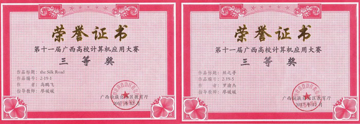 近日,从第十一届广西高校计算机应用大赛颁奖暨广西高等教育学会计算机基础教育专委会2017年会出传来喜讯,我校理工系学生罗渝杰的作品“the Silk Road”和高鹏飞的作品“丝之寻”获得了本次大赛三等奖。