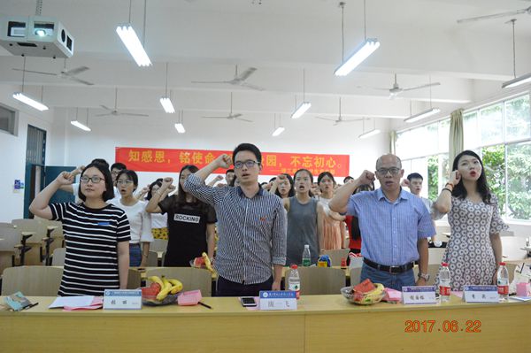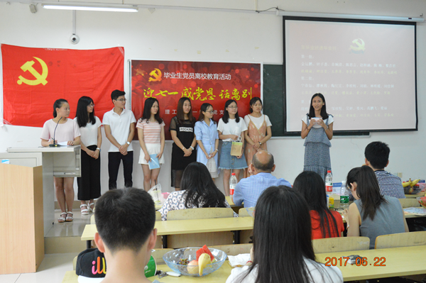 理工系党总支副书记张丽在会上为全体党员宣读了漓江学院党委致毕业生党员的一封信《守望党旗下的信仰》,号召全体党员离开母校也要时刻牢记党员身份,努力践行社会主义核心价值观,用实际行动践行党旗下的诺言,在新的岗位上脚踏实地、勇于担当,讲好新的漓院故事。随后,张丽副书记带领全体党员重温了入党誓词。