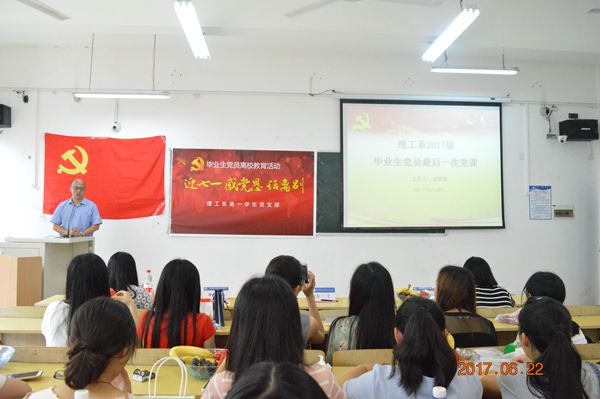 理工系党总支书记谢国榕为毕业生党员上了最后一节党课,引领党员正确理解《中国共产党纪律处分条例》的意义和要求,并详细解读了《中国共产党问责条例》、《中国共产党廉洁自律准则》和《中国共产党纪律处分条例》之间的关系,并围绕诚信做人、踏实做事、天道酬勤三个方面讲述了他对毕业生党员的要求和期许。