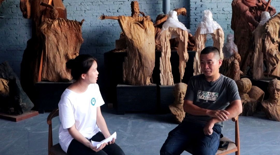 实践团还前往桂林象山区木雕工作室拜访了桂林木雕非遗传承人潘葵。采访中,潘老师分享了自身从模仿父辈到创新实践的历程,以及对“残缺美”的理解和木雕传承的展望。在潘老师的工作室,队员们既见到了以李叔同、鲁迅等名人为题材的传统木雕作品,其细腻刀法将人物神态、服饰纹理刻画得栩栩如生;也看到了充满创意的抽象作品——如用废铁结合灵感创作的独特雕塑,体现了艺术创新与环保理念的融合,让木雕在跨界中焕发新活力。此外,潘老师还讲述了创办工作室的初衷及未来推广计划,展现出非遗传承人的热爱与执着。队员们在观察作品、聆听构思中,深刻感受木雕“以刀为笔,以木为纸”的独特魅力与时代内涵。