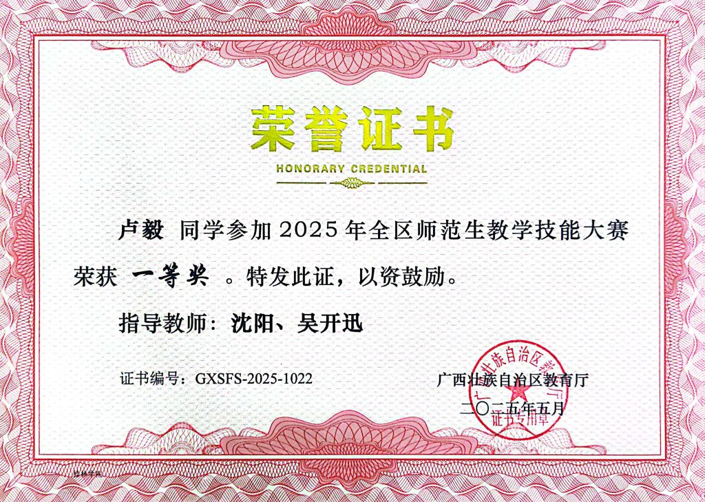 近日,在自治区教育厅正式揭晓的2025年广西区师范生教学技能大赛获奖名单中,我院2023级数学与应用数学专业学生获数学高中组一等奖,实现该专业在此项赛事中的重大突破;2022级数学与应用数学专业学生荣获三等奖。