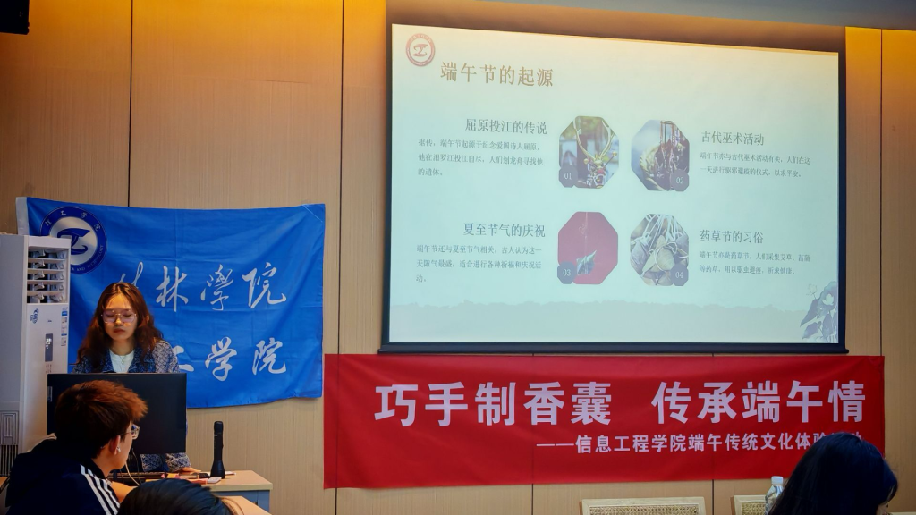 活动中,团总支书记通过PPT介绍了端午节的起源、习俗及文化内涵,包括屈原故事、赛龙舟、包粽子等传统习俗,并重点讲解了香囊的历史与寓意。在有奖问答环节,同学积极分享家乡端午习俗,现场气氛活跃。
