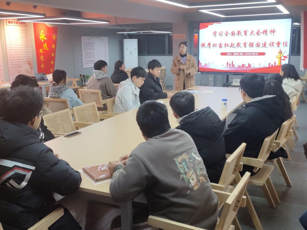 会上,学生社区党支部书记以《学习全国教育大会精神挺膺担当扛起教育强国建设重任》为主题,为学生党员讲了一堂党课。她紧紧围绕习近平总书记在全国教育大会上的重要讲话精神,从深刻认识教育的“三重属性”、深刻理解教育强国的科学内涵、正确认识和处理教育强国建设五个重大关系、全面理解全力推动全国教育大会精神落地见效的相关措施等五个方面进行了系统阐述和全面讲解。党课内容政治站位高、联系实践性强,对学生党员深入领会全国教育大会精神,进一步提升党性,统一思想具有重要意义。