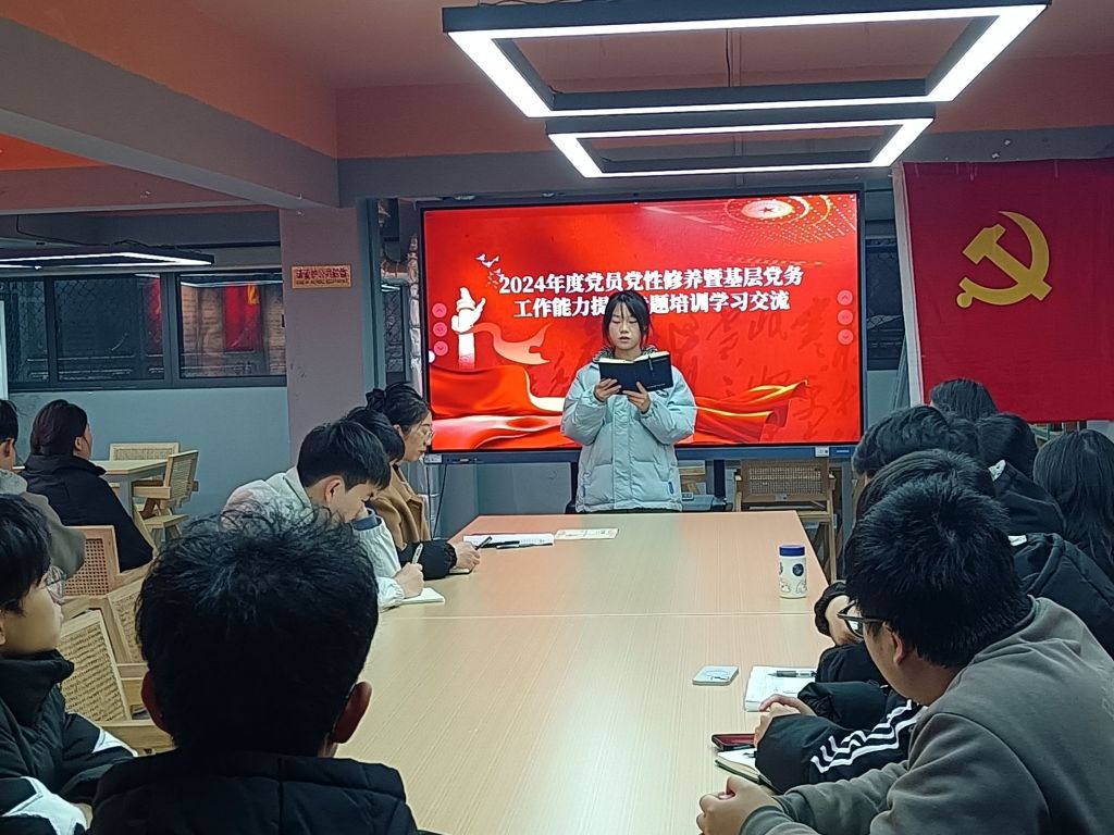 随后,开展2024年度党员党性修养暨基层党务工作能力提升专题培训学习交流会,党员依次就“党性修养提升、发挥党员先锋模范作用与推动学院学校高质量发展”主题进行学习心得分享。2022级软件工程专业方婧怡结合个人参与科研项目的经历谈学习心得,她表示作为一名理工科学生,应当学习贯彻科技创新精神,将科研成果转化为推动社会进步的动力。党员要在科技创新中发挥带头引领作用,倡议大家积极参与到创新的浪潮中。