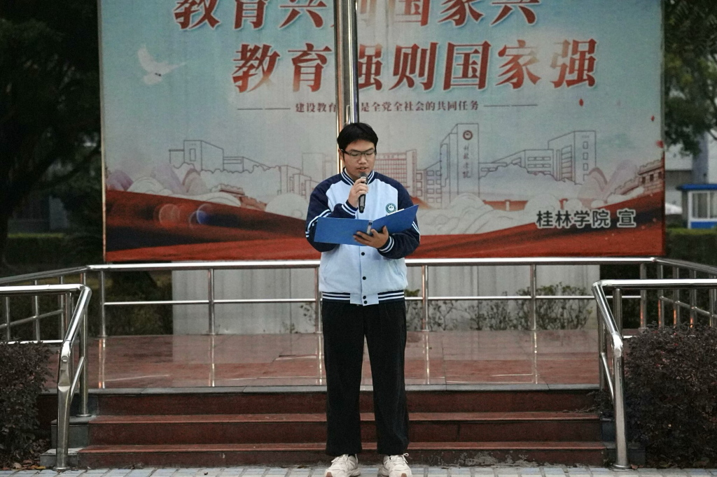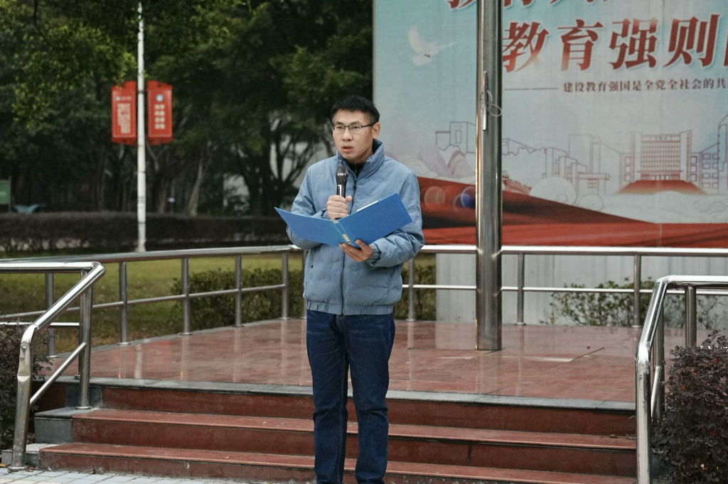 2022级物联网工程专业预备党员胡明强在国旗下讲话,他倡议同学们能够树立廉洁意识,坚定道德信念;践行廉洁行为,营造良好风尚;加强自我监督,勇于担当责任;传承廉洁文化,弘扬传统美德。