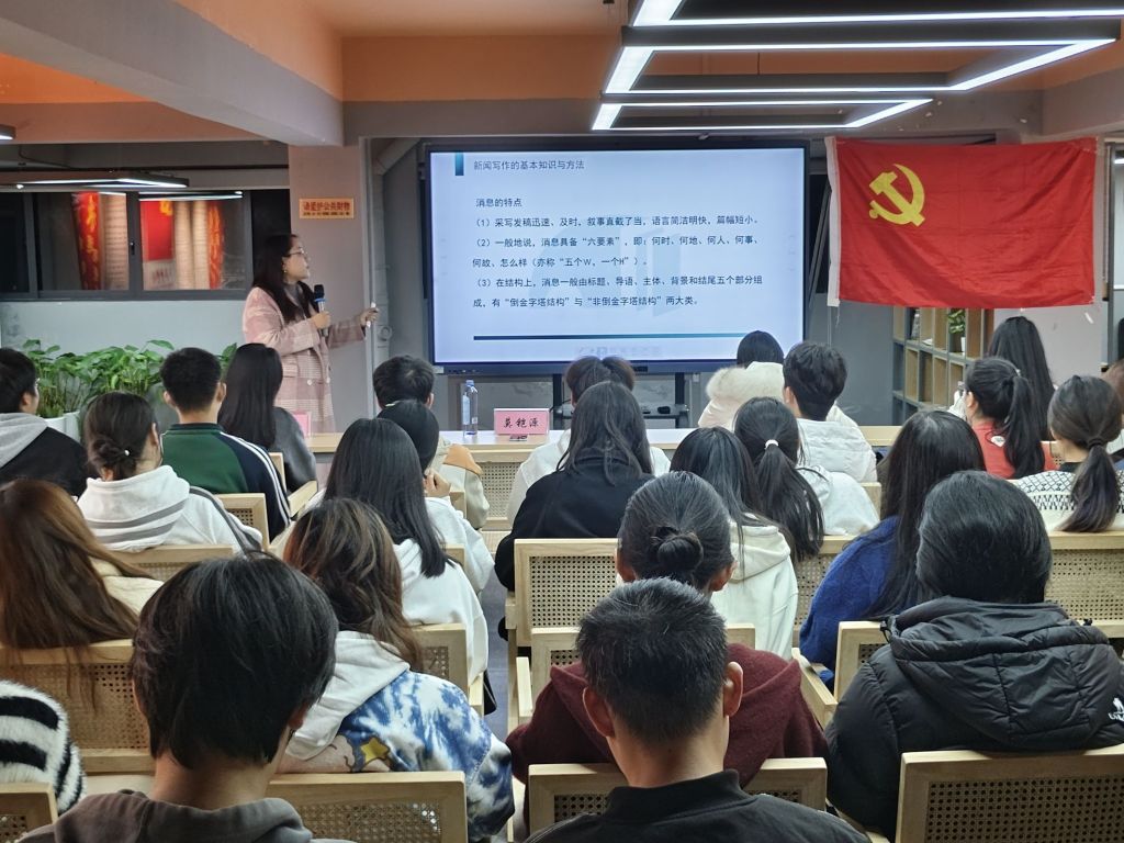 11月26日晚,理工学院“头雁”工作坊在学生社区党团活动中心举办“新闻稿写作”培训讲座。本次特邀校党委工作部宣传专员莫铠源老师担任主讲嘉宾,活动由理工学院学生党支部副书记主持,学生社区党支部书记、团总支书记出席活动,党务中心、团学等宣传部门成员、学生党员及入党积极分子共60人参加活动。