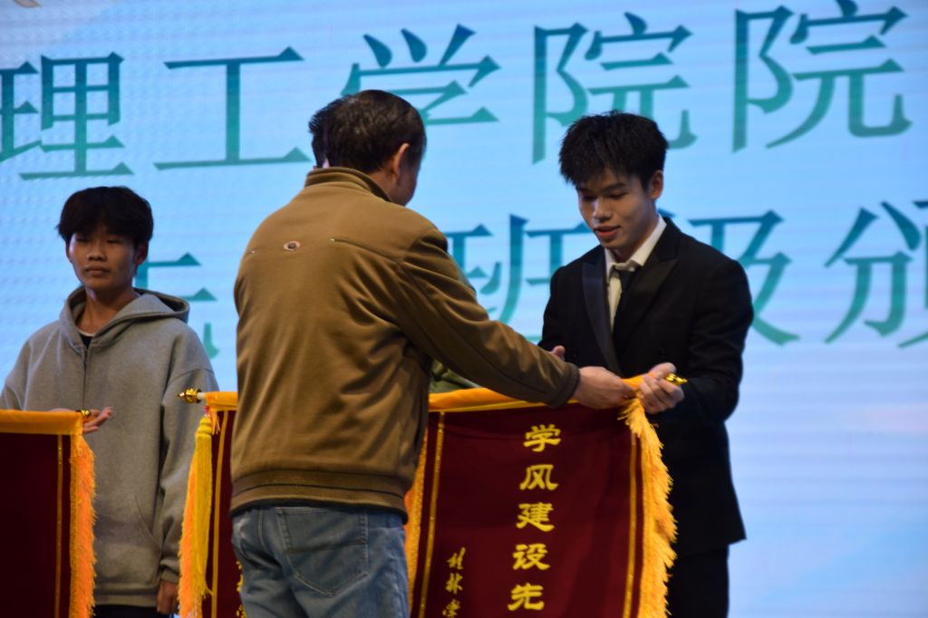 随着主持人宣读活动评比要求和会议流程,活动正式开始,理工学院副院长为本次活动致辞,他表示,学风建设先进班级的评比不仅仅是对优秀班级的表彰,更是对所有班级的激励和鞭策。接着,团学生活部汇报了2023-2024学年各班级课堂出勤与教师评价情况。随后各参赛班级代表依次上台,从班级建设、学风营造、团队活动、学业成果等多方面介绍了各班级在过去一年中的学风建设取得的成绩。参会嘉宾根据班级的学习成绩、考勤情况、班级文化建设等多个指标进行综合评分。经过激烈角逐,最终2022级软件工程1班、2022级数据科学与大数据技术1班、2023级数学与应用数学1班斩获前三名,理工学院院长为获得2023-2024学年学风建设先进班级进行颁奖。