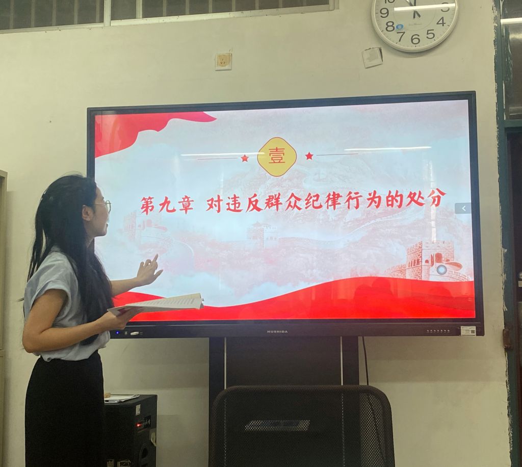 党总支组织员领学《中国共产党纪律处分条例》,结合警示案例,详细解读《条例》第九章至第十一章原文。她指出,作为教育工作者,要把洁身自好作为重要关口,保持良好生活作风,注意言行举止,当好优良党风的引领者、维护者。