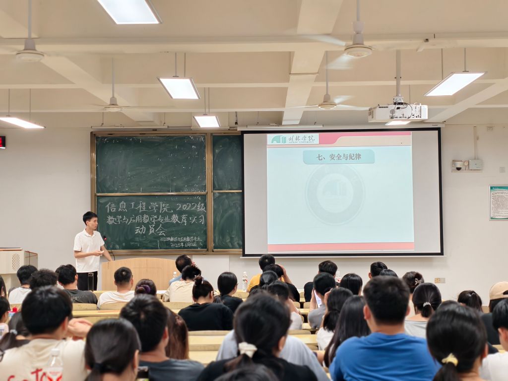 6月20日晚,信息工程学院在1314教室召开2025届数学与应用数学专业教育实习动员会,全体2022级该专业学生参会。会议由数学教研室副主任主持,学院副院长、教研室主任及辅导员出席。
