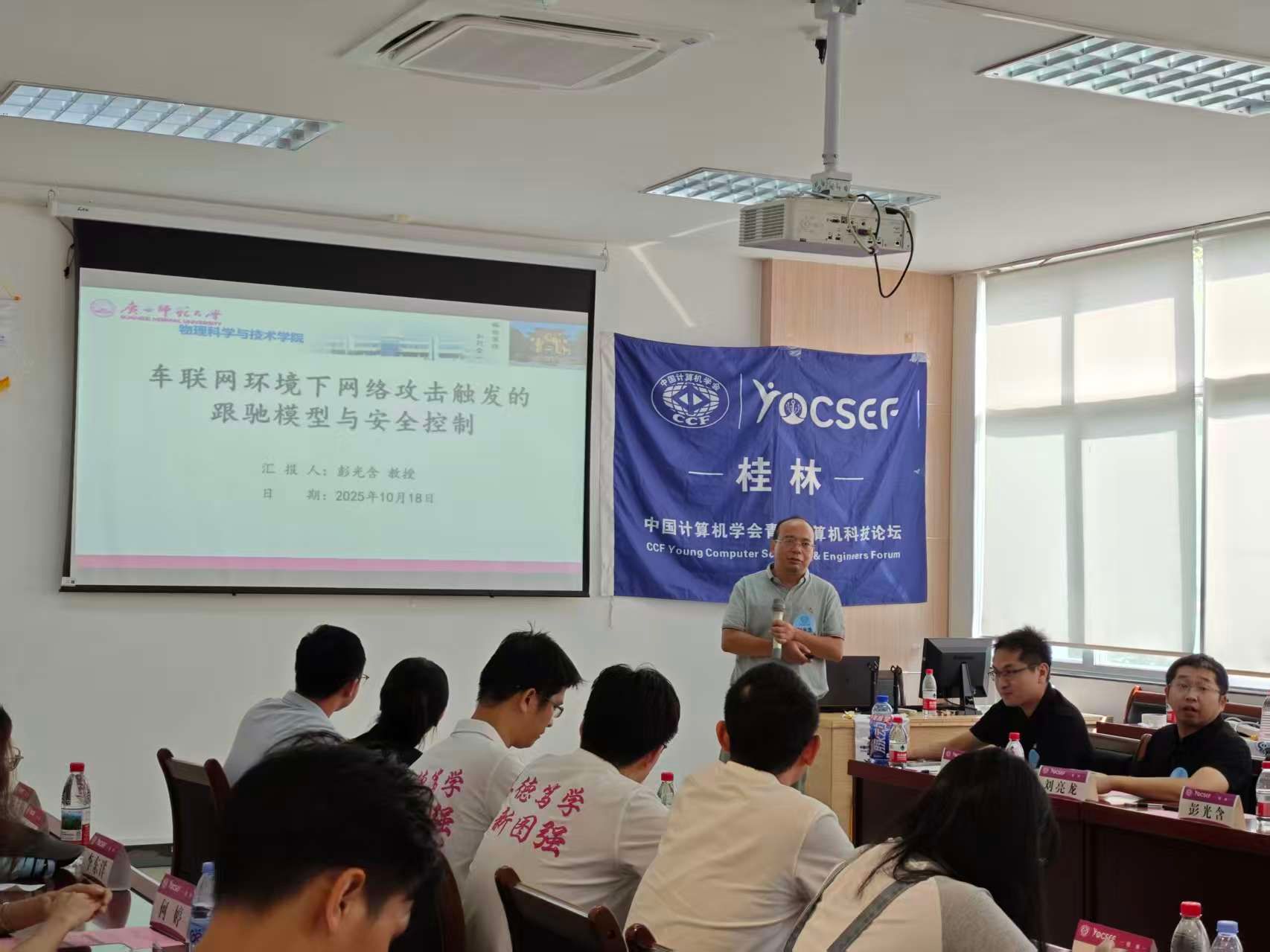 论坛由信息工程学院副院长与桂林电子科技大学章一才博士共同担任执行主席。CCF YOCSEF桂林主席邱斌出席并致辞,介绍了YOCSEF的文化理念与桂林分论坛的发展历程。在主题报告环节,广西师范大学彭光含教授围绕交通联网安全控制探讨了交通系统中网络攻击的防控策略;桂林电子科技大学周长红教授系统介绍了平陆运河的智慧化建设进展与实际平台案例;徐奇教授则围绕内河船舶过闸调度中的智能生成技术,阐述了人工智能在具体场景中的实践路径。