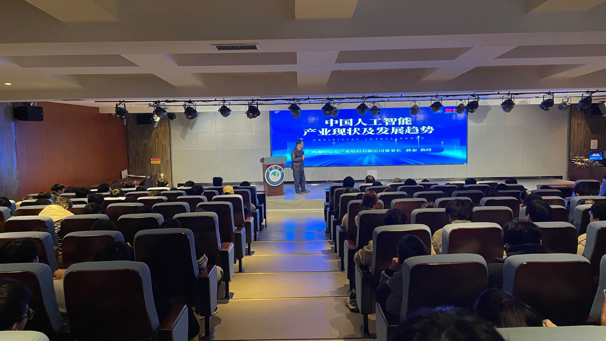 2025年11月20日,信息工程学院在至善讲堂成功举办“中国人工智能产业现状及发展趋势”专题讲座。本次讲座特邀广西瀚特信息产业股份有限公司董事长蒋泰教授担任主讲,围绕人工智能的发展历程、技术体系、产业应用与未来趋势展开系统讲解。讲座吸引了学院师生的广泛参与,现场反响热烈。