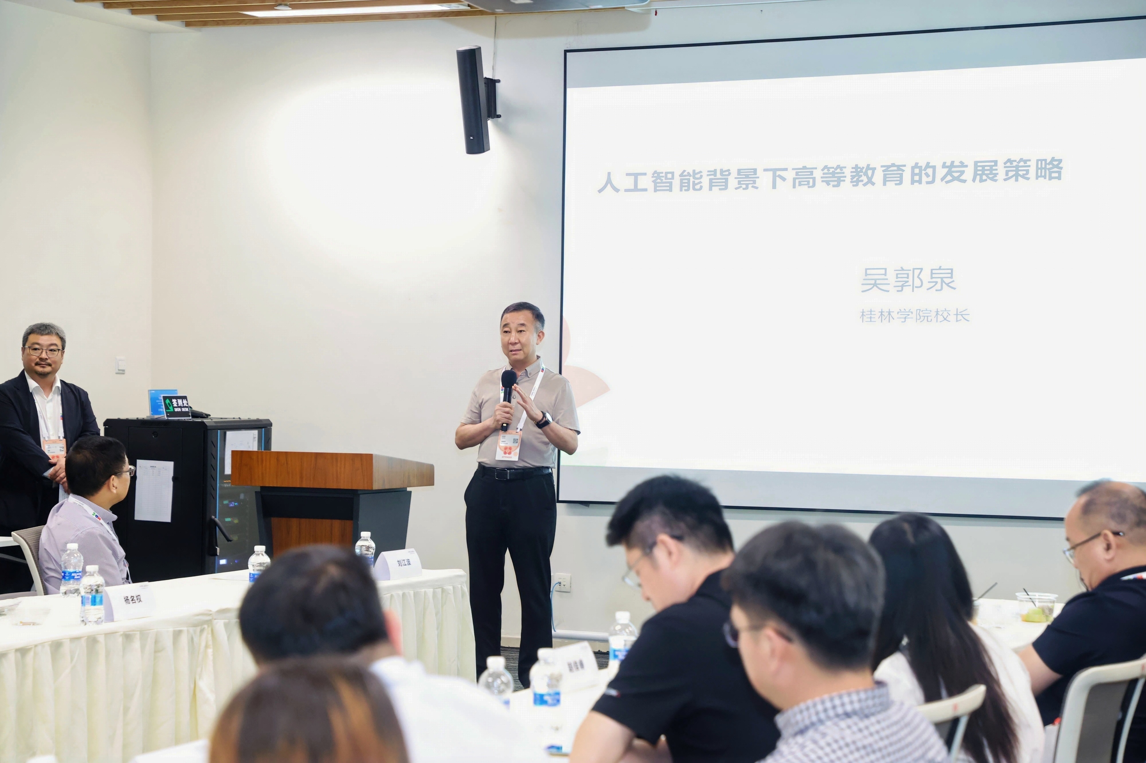 在大会期间,吴郭泉校长和杨庆庆副校长受邀出席了4场高峰论坛。在《AI重塑教育 协同定义未来教育》的教育高峰论坛上,吴郭泉校长做了题为《人工智能背景下高等教育的发展策略》的发言,介绍了我校的基本情况,分享了我校在相关领域的探索与实践,阐述了面向未来的高等教育发展路径,其前瞻性观点引发了与会教育界同仁与行业专家的高度共鸣与热烈讨论。