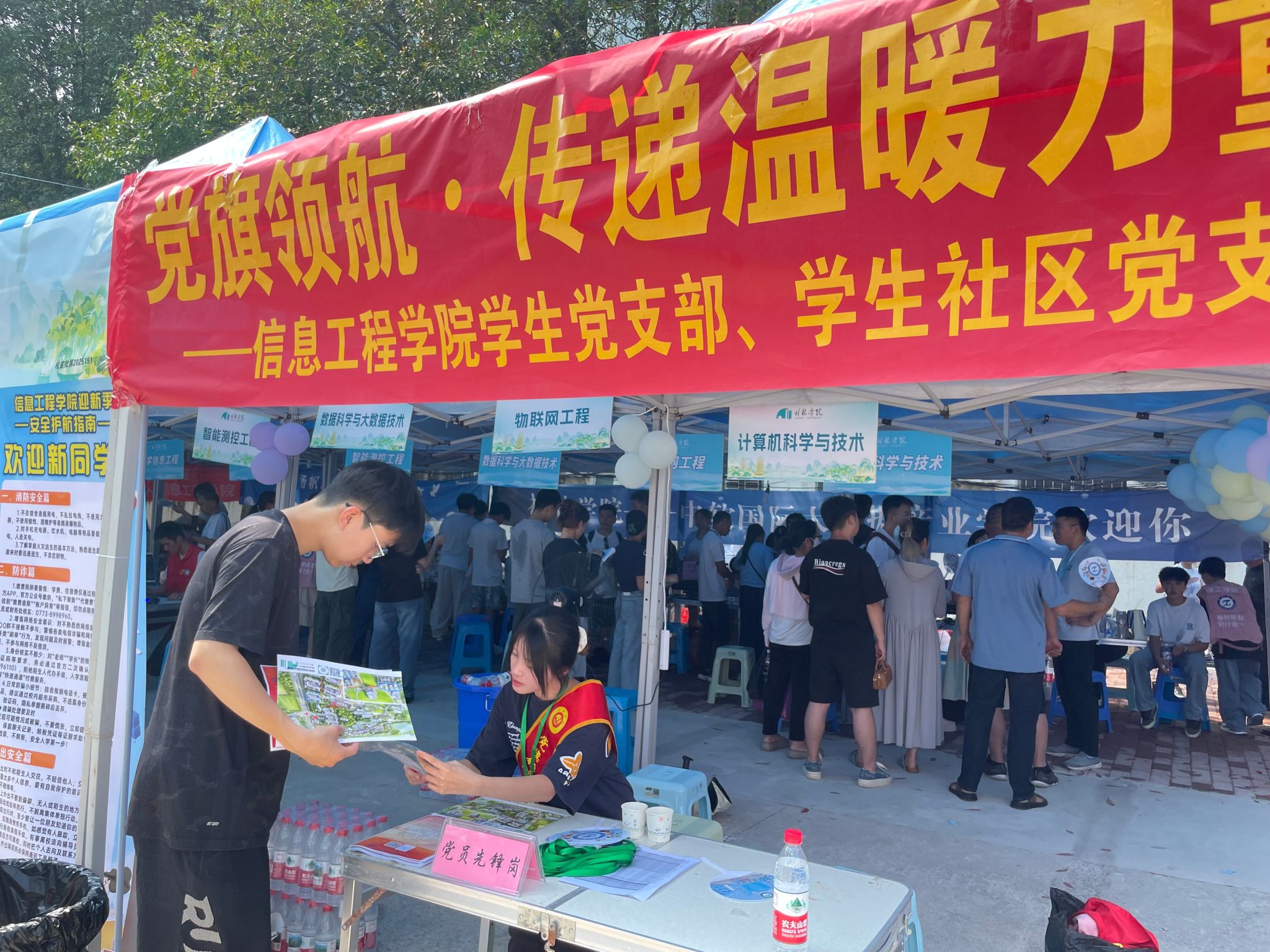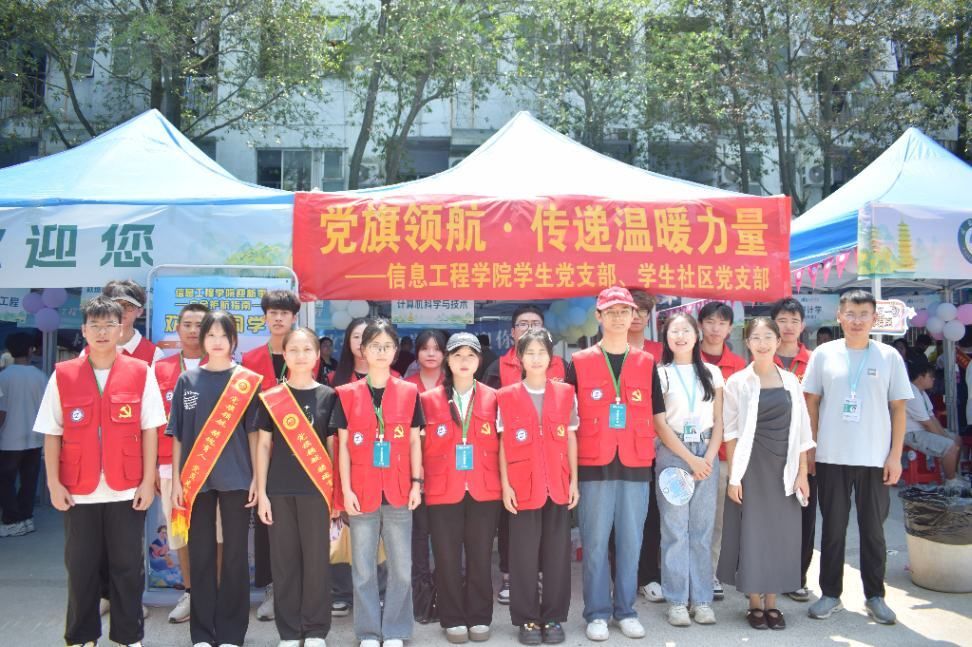 秋阳高照,又是一年迎新时。9月7日,信息工程学院迎来2025级新生报到日。为充分发挥基层党组织战斗堡垒作用和党员先锋模范作用,信息工程学院学生党支部、学生社区党支部精心组织开展“党旗领航,传递温暖力量”主题迎新活动,以党建引领志愿服务,让新生从踏入校园第一刻起就感受到党组织的温暖与关怀。