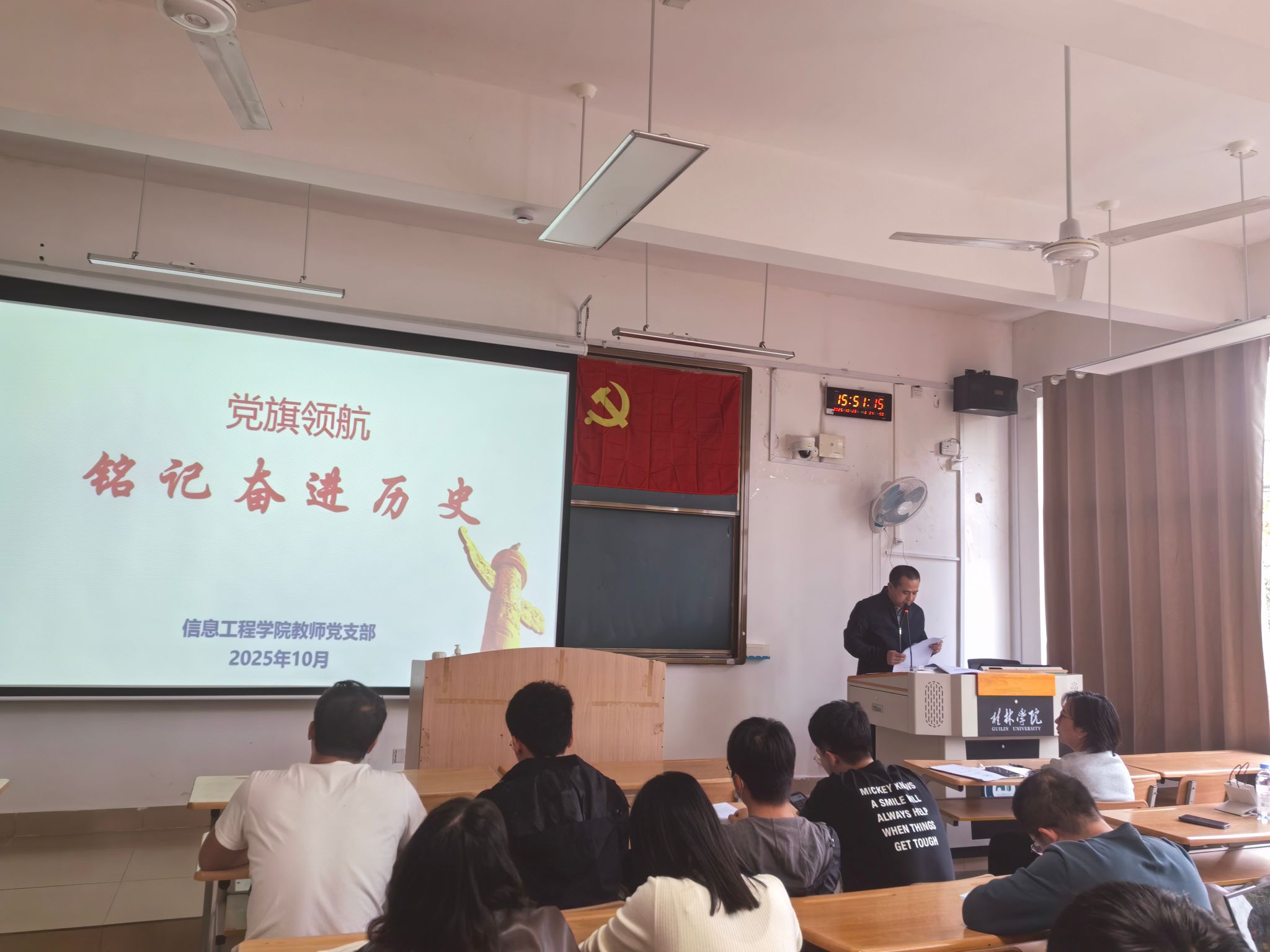 10月29日下午,信息工程学院教师党支部在1405教室开展“党旗领航・铭记奋进历史”主题党日活动,支部全体党员参加了本次活动。此次活动通过理论学习、观看视频、座谈讨论等形式,深化了党员的理想信念,凝聚了奋进的力量。