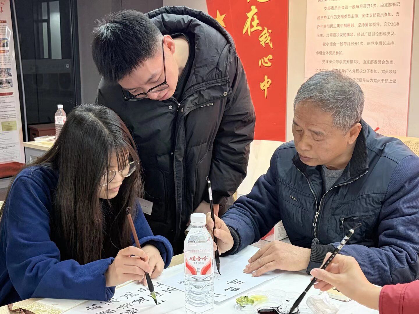 随后进入卷轴书写体验环节,参与人员自行组队投入创作,核心体验毛笔书写廉洁主题诗句的创作过程,创作现场墨香四溢,大家凝神静气手握毛笔,或书写“以笔绘廉”“以画传正”的活动主题,或挥毫“廉洁奉公”“两袖清风”等经典短句,每一笔起落都饱含对廉洁精神的敬畏,每一个字迹都承载着尚洁向善的追求,让毛笔书写的艺术魅力与廉洁主题的精神内涵深度融合。师生们在笔墨丹青间感悟廉洁内涵,传承清风正气。
