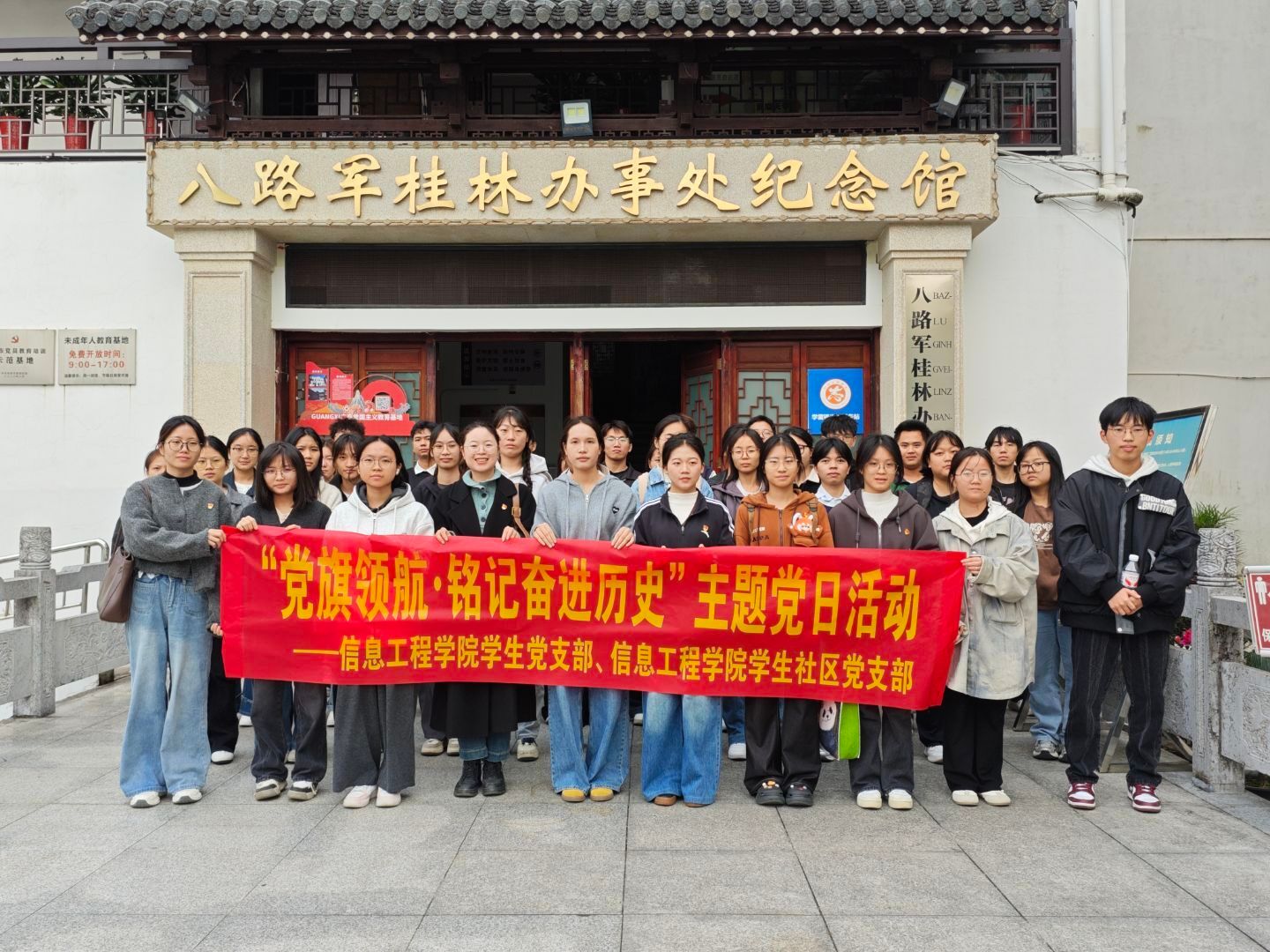 为深入学习贯彻习近平新时代中国特色社会主义思想,加强党员与入党积极分子的思想政治教育,引导青年学子铭记奋斗历史、传承红色基因,10月22日,信息工程学院学生党支部联合学生社区党支部组织支部成员前往桂林八路军办事处开展“党旗领航・铭记奋斗历史”主题党日活动。