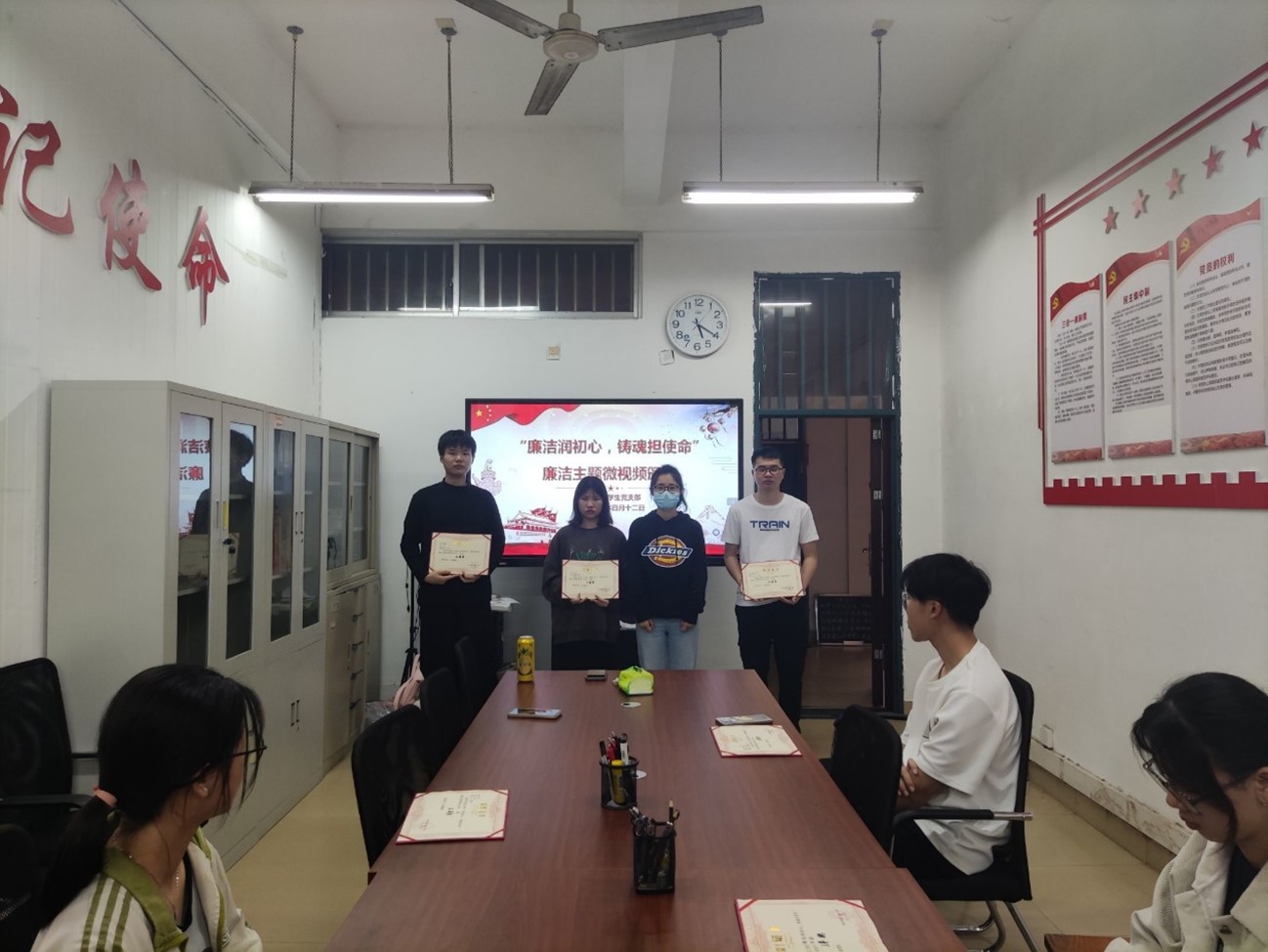 为使我院师生更加深入学习和落实党的二十大精神,贯彻实施党中央《关于加强新时代廉洁文化建设的意见》,引领廉洁文化建设,用中华优秀传统文化涵养清廉自守的精神境界,同时,夯实师生理想信念思想根基,培养廉洁自律的道德操守,展现我院清明政风,清正教风,清新学风的校园建设环境,让同学们体会到清正廉洁永远是时代的呼唤,勤政、廉政永远是人民的期盼,我院学生党支部开展了“廉洁润初心 铸魂担使命”主题活动,并于4月12日举行了颁奖仪式。我院学生党支部书记王少鹏、参赛学生及党建信息员出席本次活动。