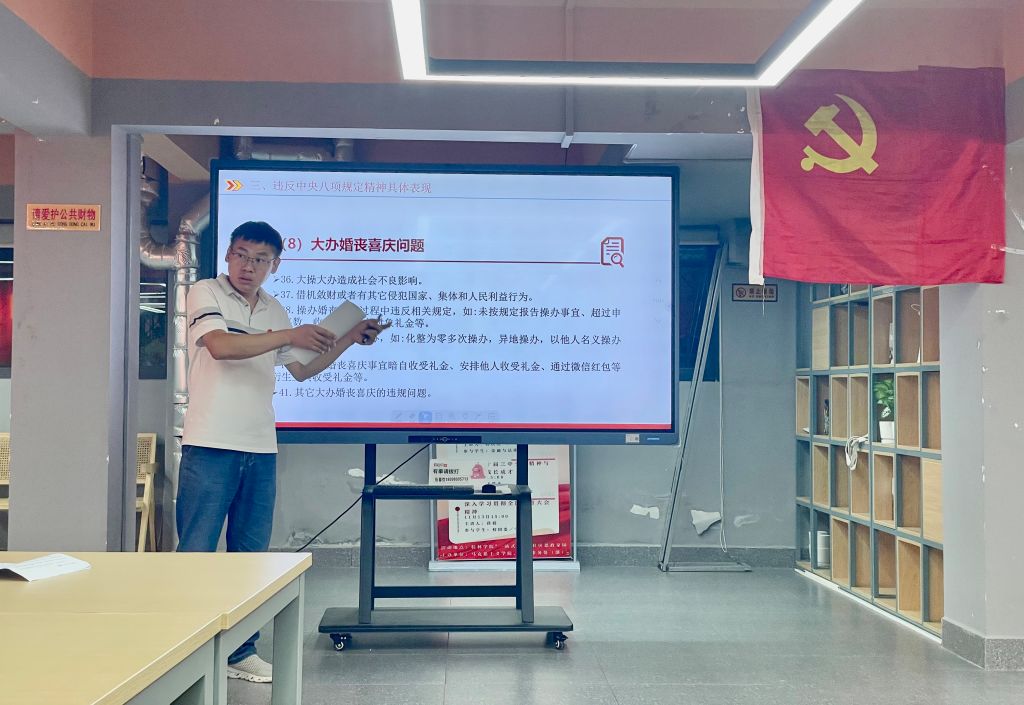 随后,通过剖析警示教育案例,副书记深入分析部分党员在廉洁自律方面的问题,以“以案说法”的形式警示全体人员引以为戒,时刻保持警醒,自觉抵制诱惑。他要求党员严格遵守党纪国法,做到“心有所畏、言有所戒、行有所止”,切实增强自律意识,牢记身份责任,不触碰廉洁红线。