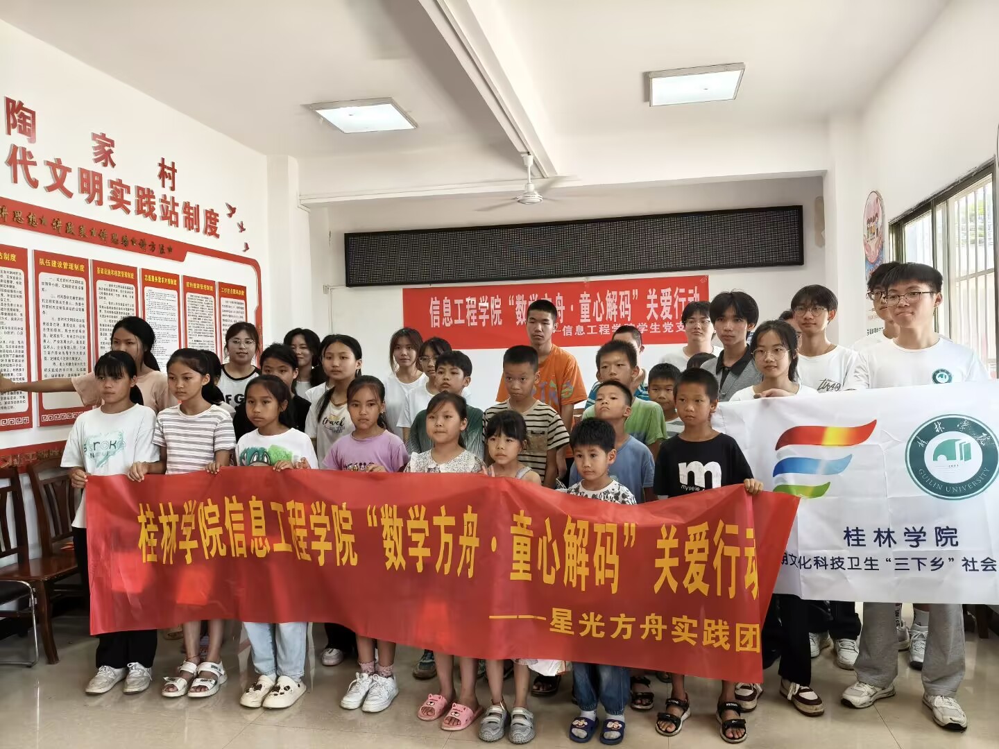 暑假期间,信息工程学院“数学方舟·童心解码”乡村振兴实践团前往桂林市雁山区大埠乡陶家村开展暑期三下乡社会实践活动。该实践团成员主要为数学专业师范生,由专任教师和辅导员带队前往。活动用创新且温暖的方式向陶家村孩子们传递数学启蒙知识以及生理与心理健康知识,激发儿童对知识的热爱,帮助儿童实现对自我的认识。