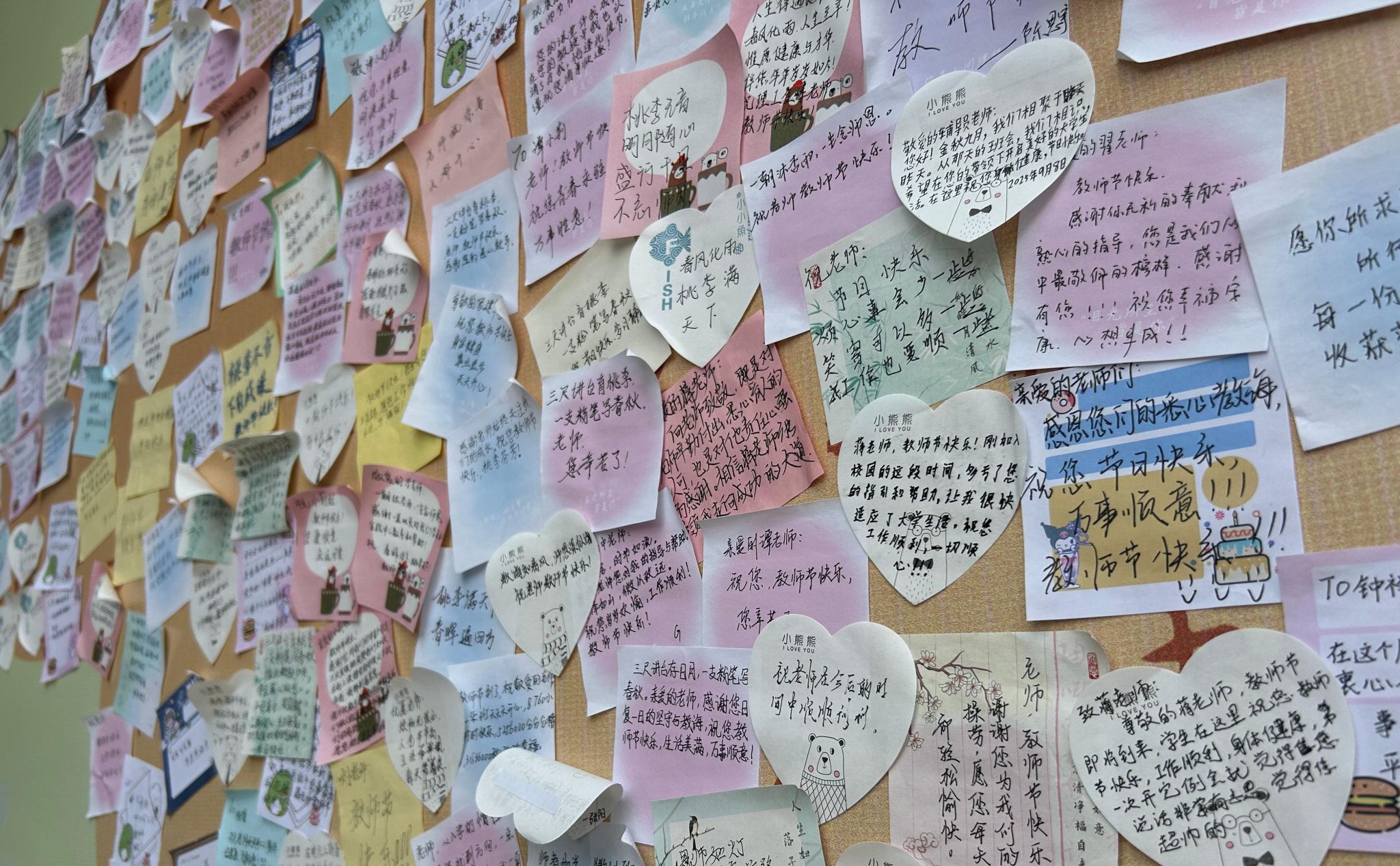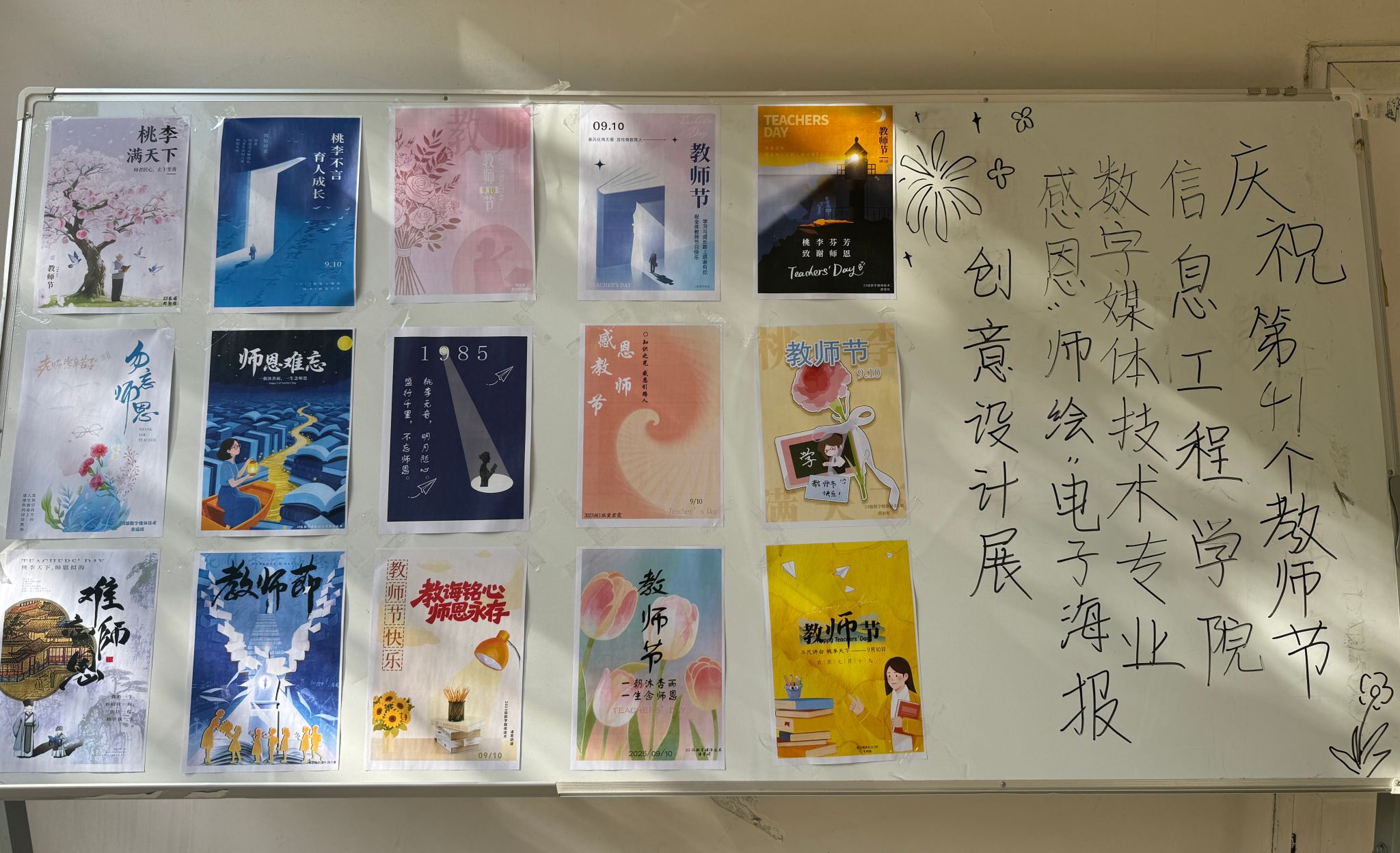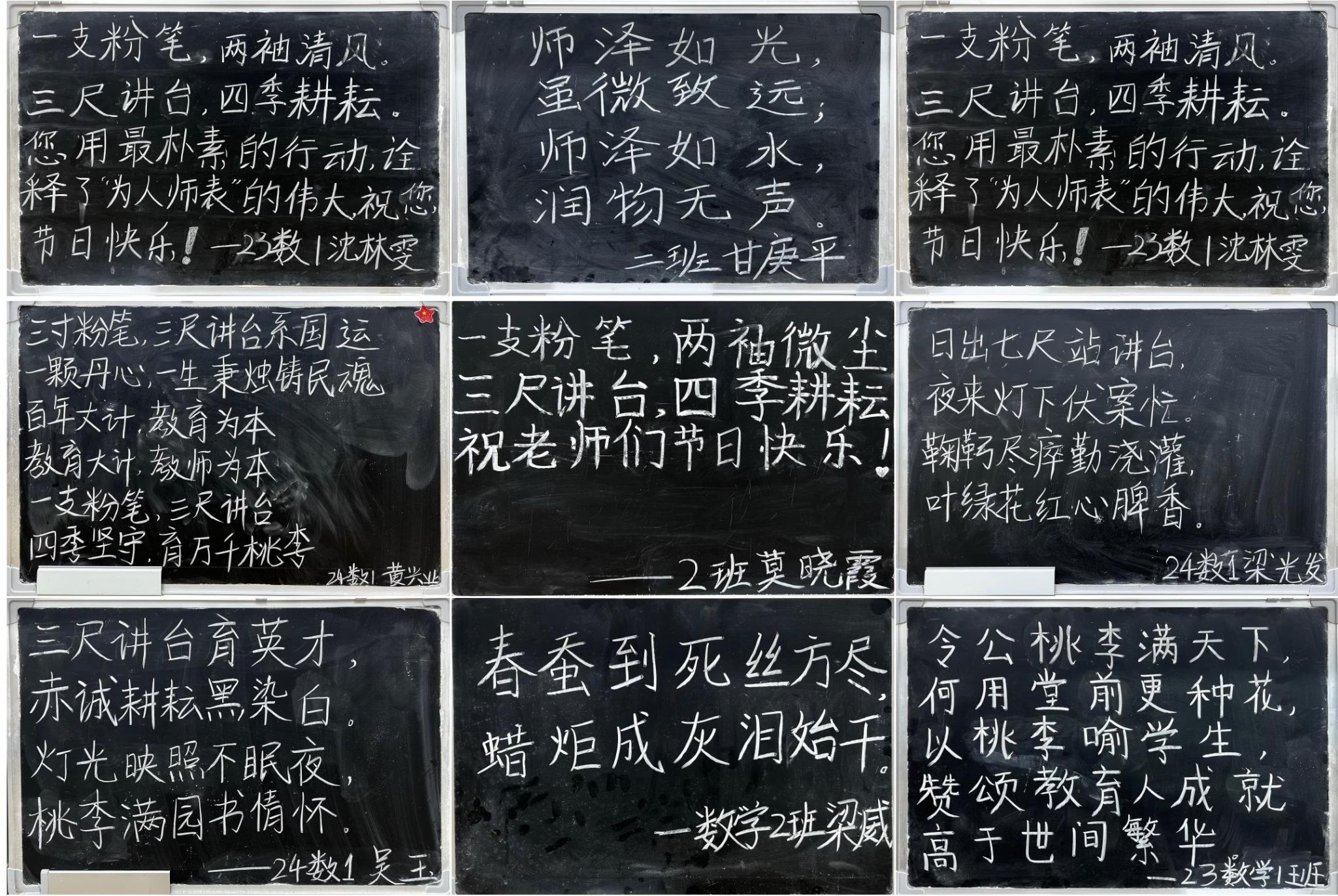 9月9日至10日,学院一楼成为师生情感联结的“温情阵地”。此前,全院各班同学踊跃参与团学发起的“笔间传情”祝福贴签行动,学生们的字里行间满是对老师的敬意与祝福,一张张便签纸汇聚成色彩斑斓的留言墙。2023、2024级数学师范专业学子以“黑板方寸地,笔抒桃李情”为主题,用粉笔在小黑板上书写感恩寄语,清秀字迹与真挚话语相映,走廊两侧的展板成为了校园里独特的“致谢风景线”。数字媒体技术专业学子则发挥专业优势,开展“感谢师‘绘’”电子海报创作,兼具设计感与温度的作品在公共区域展出,用视觉语言诠释“师恩似海深”的深情。