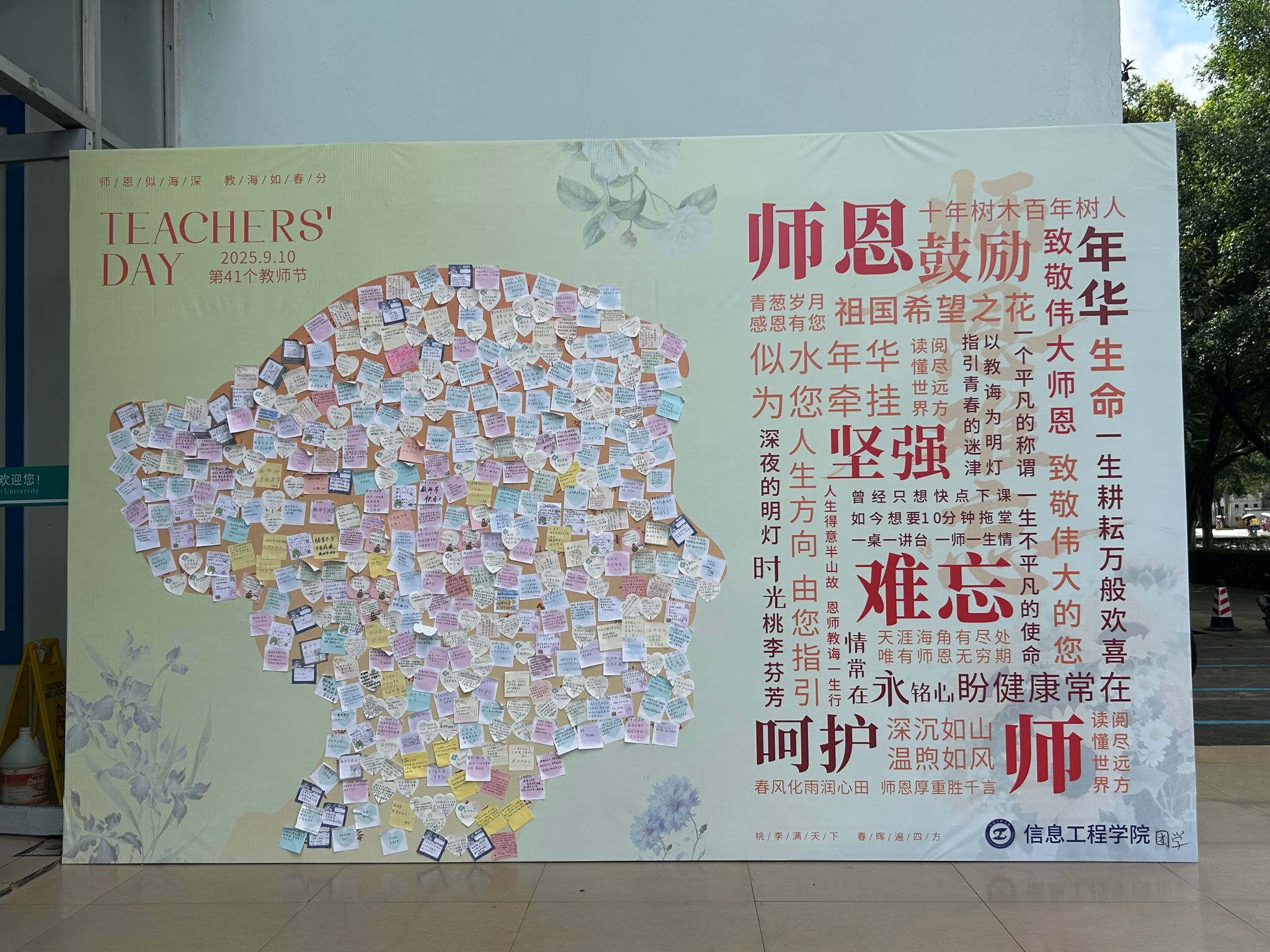 在第41个教师节来临之际,为传承尊师重道传统美德、营造崇德向善的校园氛围,信息工程学院团总支学生会统筹策划系列庆祝活动,带领全院同学以专业所长与创意巧思,向辛勤耕耘的老师们献上满含心意的节日祝福。