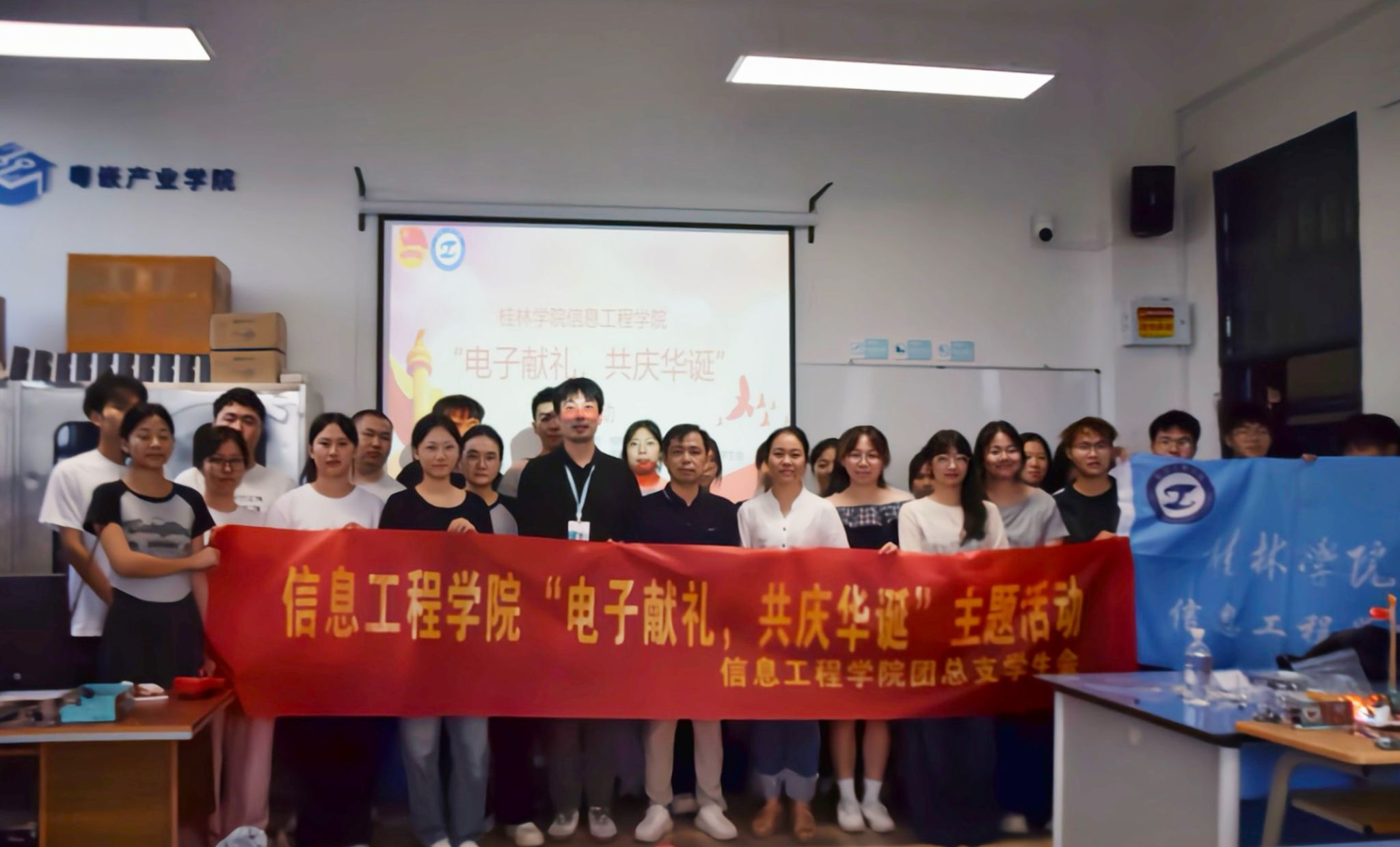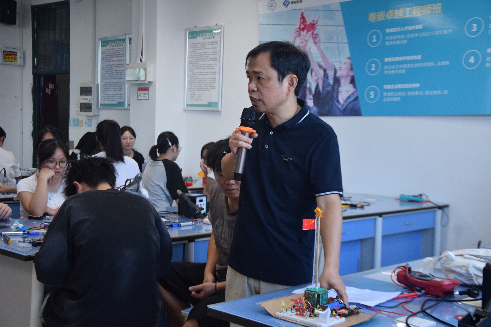 10月16日,信息工程学院在至善楼电子电路综合实验室举办“电子献礼,共庆华诞”主题实践活动,庆祝中华人民共和国成立76周年。来自学院各专业的数十支学生团队同台竞技,依托电子技术设计制作富含国庆元素的创意作品,展现专业素养与爱国情怀。智能测控工程专业负责人、学院团总支书记及副书记到场指导。