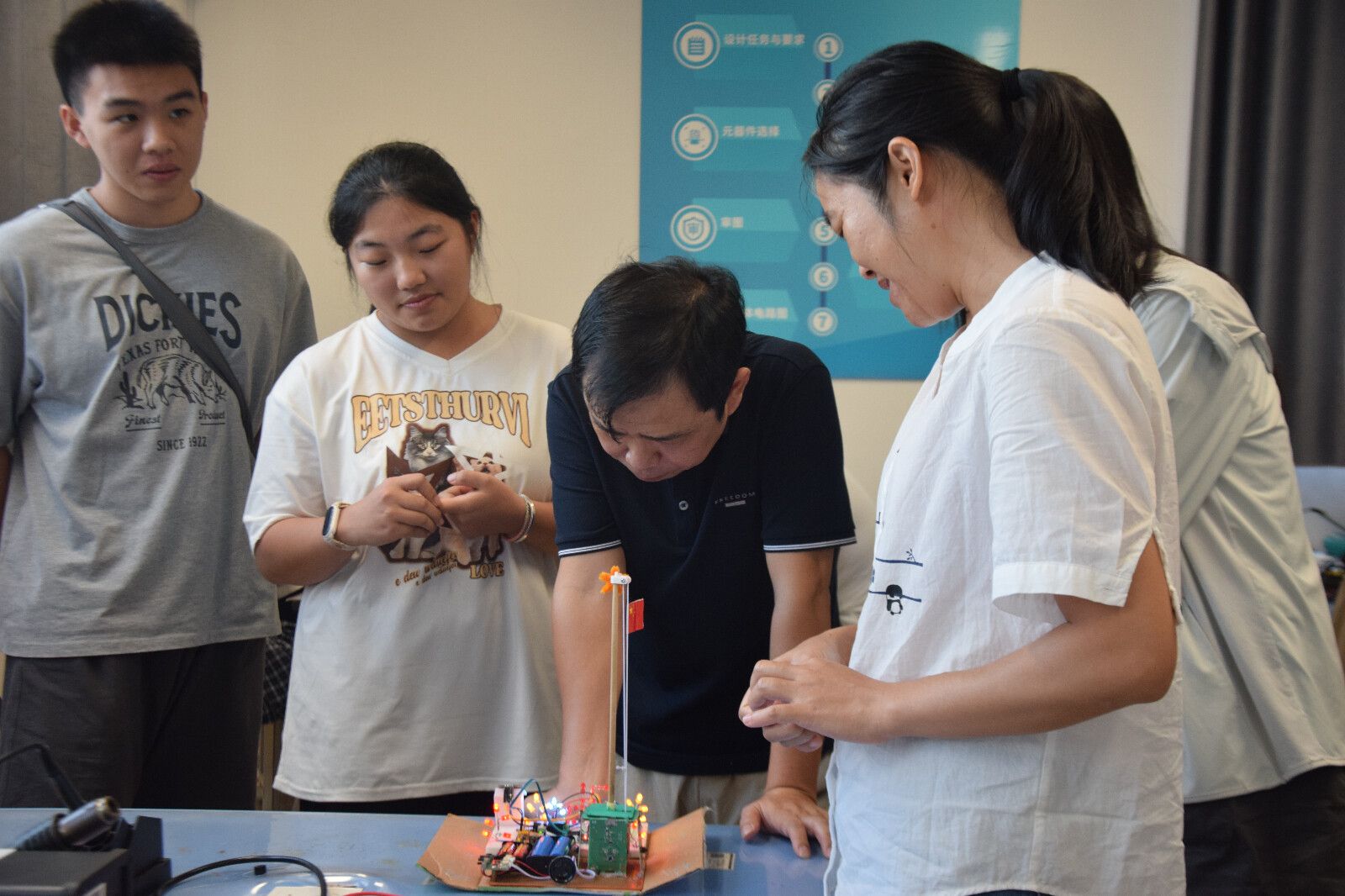 活动尾声,谢军华对参赛作品进行集中点评。他充分肯定了学生们将科技创新与爱国情怀有机融合的创意实践,认为此次活动不仅锻炼了学生的动手能力与工程素养,更是一堂生动的“课程思政”实践课。同时,他就部分作品在电路布局、灯光效果优化等方面提出改进建议。
